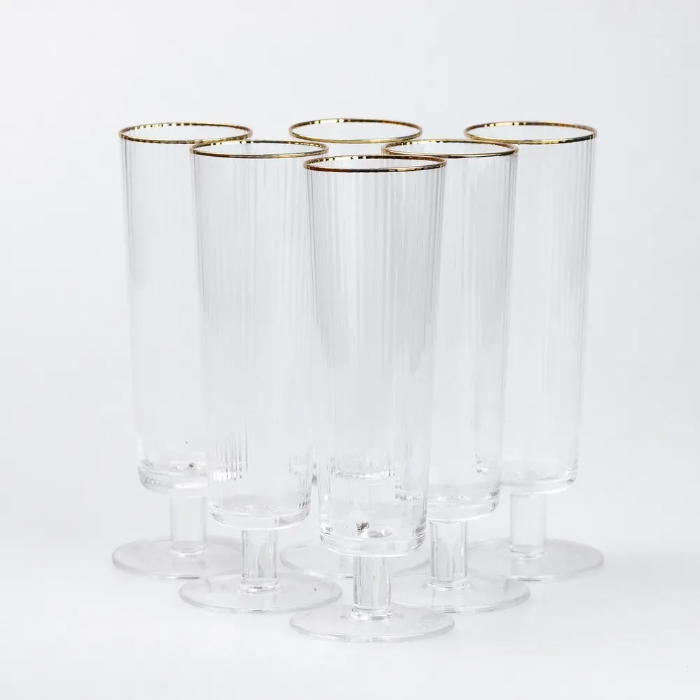 Фигурные бокалы для шампанского из тонкого стекла придадут вашему торжеству изысканный вид. Ребристая текстура придает изысканности, а золотой ободок завершает элегантный дизайн.