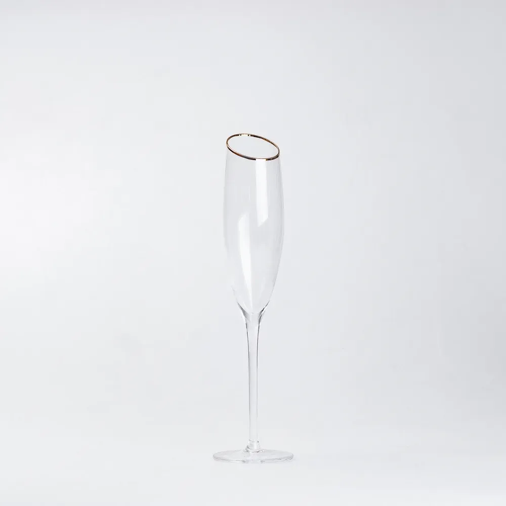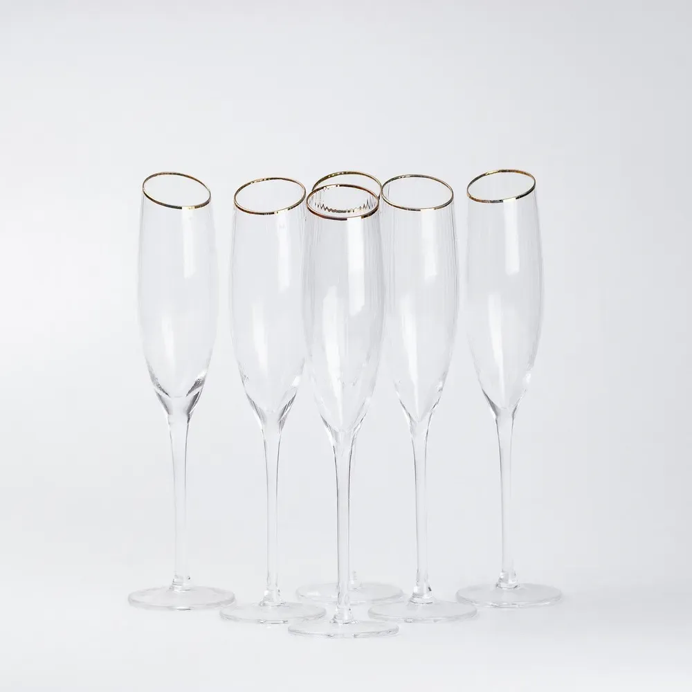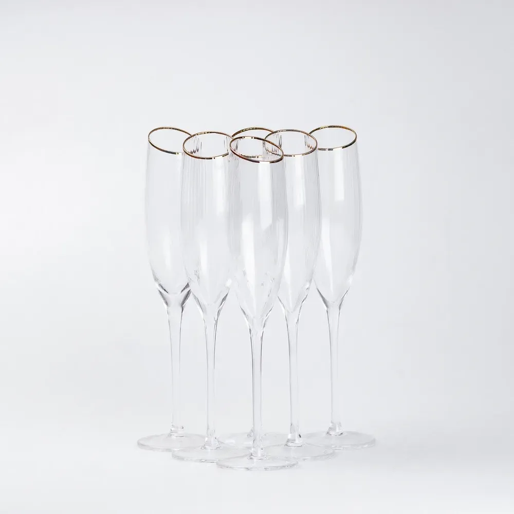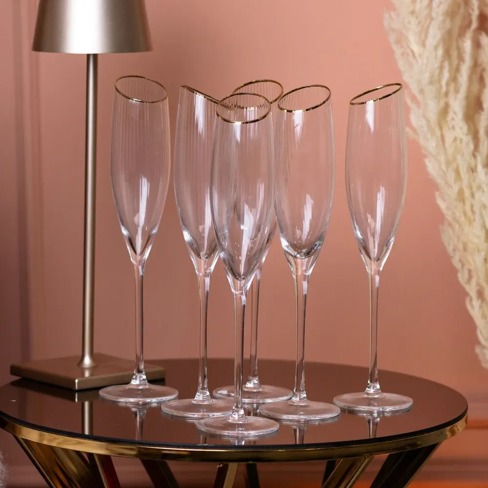 Фигурные бокалы для шампанского из тонкого стекла придадут вашему торжеству изысканный вид. Ребристая текстура придает изысканности, а золотой ободок завершает элегантный дизайн.