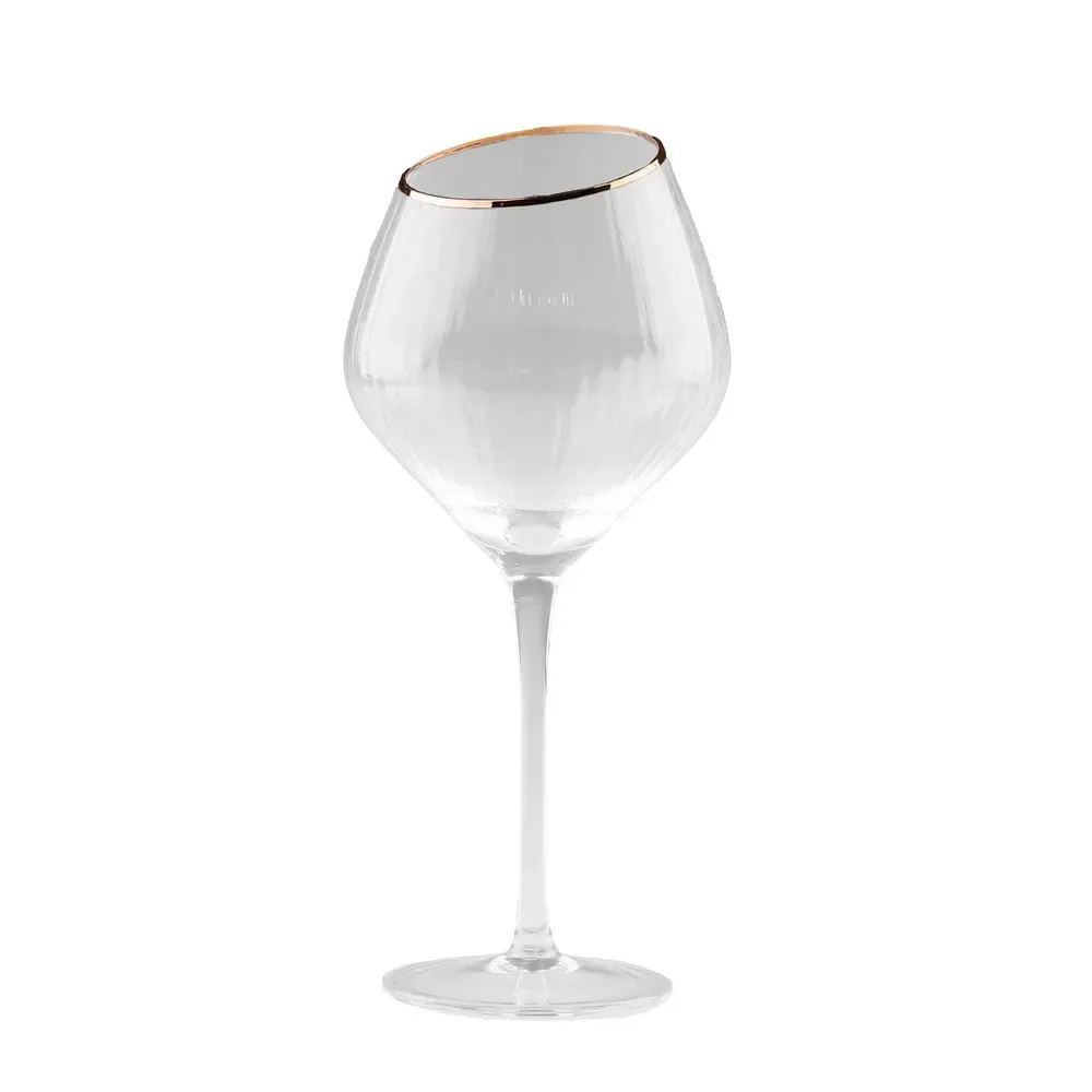 Высокие фигурные бокалы для вина из прозрачного, ребристого стекла с золотым ободком - это изысканное дополнение к вашему столу.