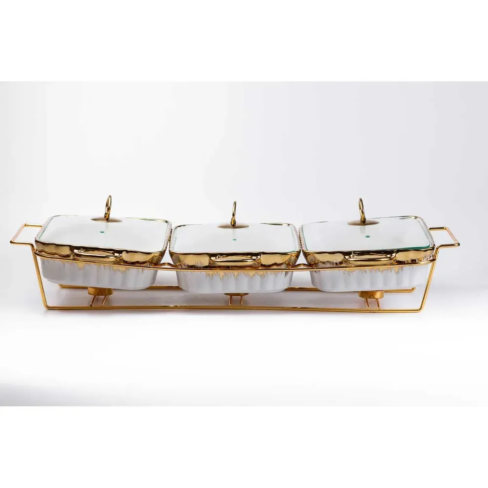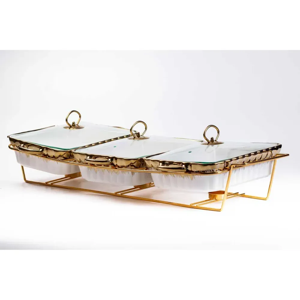 Керамічна мармітниця з трьома секціями по 1,5 літра кожна стане ідеальним рішенням для зручного зберігання і подачі різноманітних страв. Її елегантний білий колір і прямокутна форма надають сучасного і стильного вигляду, що чудово вписується в будь-який інтер'єр. Високоякісна кераміка забезпечує рівномірне нагрівання та тривале збереження тепла, роблячи цю мармітницю ідеальним вибором для сервірування страв на тривалий час. Скляні кришки дозволяють легко контролювати процес приготування, зберігаючи тепло і аромат страв. Характеристики: Розміри: 68*33*17 смВага: 7.620 кгОб'єм однієї секції: 1,5 літраМатеріал: кераміка, скло, нержавіюча сталь Переваги: Золотиста металева підставка з підігрівом додає мармітниці не лише розкішного вигляду, але й функціональності, підтримуючи оптимальну температуру їжі протягом тривалого часу. Ця мармітниця стане центральним елементом вашого столу, незамінним помічником для великих обідів або святкових заходів. Догляд: Рекомендується ручне миття з використанням м’яких миючих засобів. Уникайте різких перепадів температури, щоб зберегти довговічність матеріалів та функціональність підігріву.