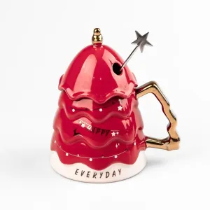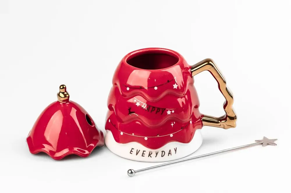 Кружка керамическая 460 мл Christmas tree с крышкой и палочкой для размешивания Красный (HP1972R)