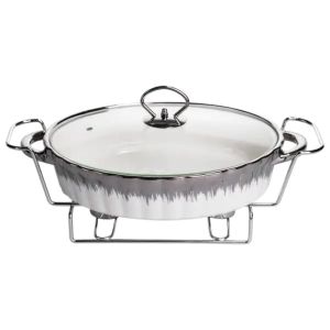 Мармітниця має овальну форму та виготовлена з порцеляни білого кольору з декоративним вкрапленням по поверхні. Такий дизайн підходить для сервірування гарячих страв під час банкетів, фуршетів або сімейних подій. Порцеляна забезпечує збереження температури та підходить для подачі різних видів страв. Виріб укомплектований прозорою скляною кришкою з металевою ручкою, що дозволяє контролювати вміст без відкривання. Кришка щільно прилягає, допомагаючи мінімізувати втрати тепла та підтримувати охайний вигляд подачі протягом усього часу використання. Мармітниця встановлена на металевій підставці з підігрівом від свічок-таблеток. Такий тип нагріву не потребує електроживлення та забезпечує рівномірне підтримання температури. Конструкція підставки стійка та розрахована на багаторазове використання.