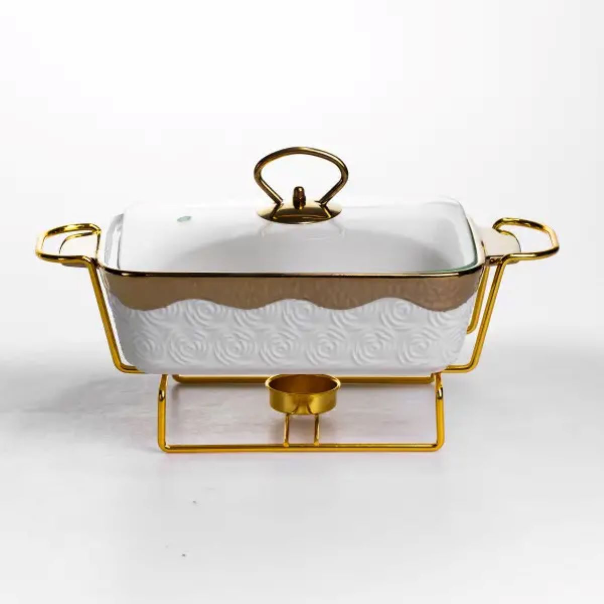 Марміт порцеляновий на металевій підставці з підігрівом — практичне рішення для подачі гарячих страв удома або під час заходів. Завдяки конструкції з підставкою та місцем для свічок-таблеток страва довше залишається теплою без підключення до електрики. Скляна кришка дозволяє контролювати вміст без необхідності відкривати ємність. Порцелянова чаша об’ємом 1 л підходить для супів, гарнірів, соусів або других страв. Металева підставка золотистого кольору забезпечує стійкість та витримує вагу виробу разом із вмістом. Компактні розміри дозволяють зручно розмістити марміт на столі, не займаючи зайвого простору. Модель розрахована на використання з двома свічками-таблетками, що забезпечує рівномірне підтримання температури. Конструкція легко розбирається для миття та зберігання. Підходить для щоденного використання або сервірування під час свят. Характеристики: Матеріал чаші: порцеляна Матеріал кришки: скло Матеріал підставки: метал Колір підставки: золотистий Об’єм: 1 л Висота: 11 см Ширина: 16 см Довжина: 31 см Вага: 1.7 кг Джерело підігріву: 2 свічки-таблетки