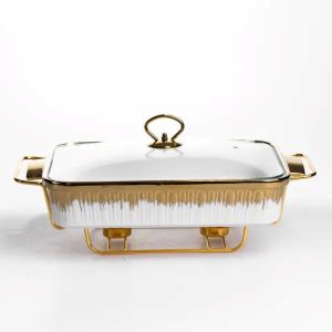 Порцелянова мармітниця об’ємом 2 л призначена для подачі гарячих страв із підтриманням температури під час сервірування столу. Компактний розмір підходить для невеликих порцій гарнірів, соусів або запіканок. Прямокутна форма забезпечує зручне розміщення на столі, а кришка допомагає зберігати тепло та акуратний вигляд страви. Конструкція доповнена металевою підставкою з місцем для однієї свічки-таблетки, яка забезпечує рівномірний м’який підігрів. Такий варіант підходить для домашнього використання або подачі під час святкових подій, коли важливо підтримувати температуру страв без додаткового підігріву. Завдяки компактним габаритам виріб не займає багато місця на столі. Порцелянова ємність у поєднанні з металевою підставкою створює практичне рішення для щоденного використання. Мармітниця легко очищується після використання та підходить для багаторазового застосування. Формат подачі дозволяє зручно організувати стіл і довше зберігати страви теплими. Характеристики: Об’єм: 2 л Форма: прямокутна Матеріал ємності: порцеляна Підставка: металева Тип підігріву: від однієї свічки-таблетки Висота: 15,5 см Ширина: 22,5 см Довжина: 40 см Вага: 3,1 кг