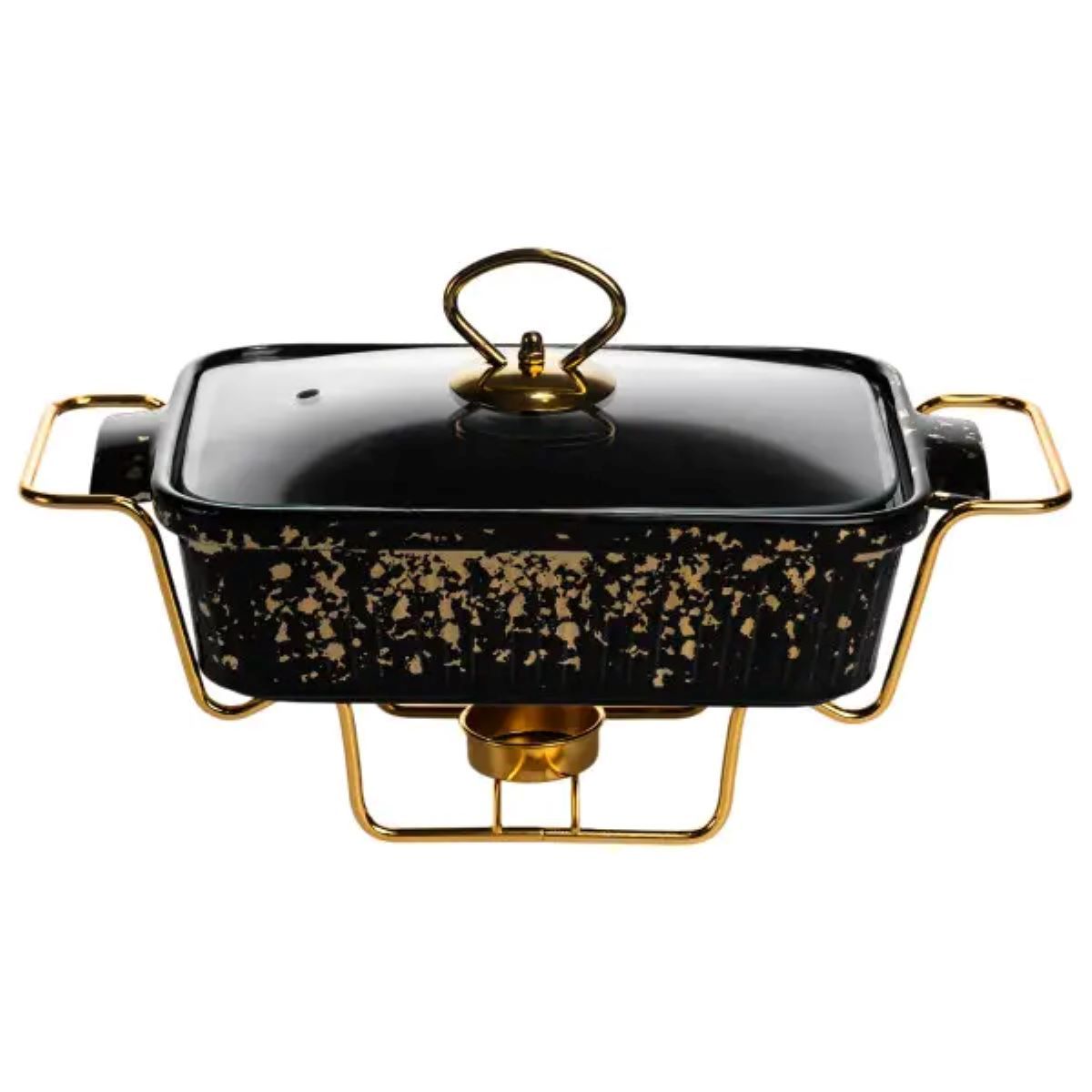 Мармітниця має прямокутну форму та виготовлена з порцеляни чорного кольору з декоративним золотистим вкрапленням по поверхні. Такий дизайн підходить для сервірування гарячих страв під час банкетів, фуршетів або сімейних подій. Порцеляна забезпечує збереження температури та підходить для подачі різних видів страв. Виріб укомплектований прозорою скляною кришкою з металевою ручкою, що дозволяє контролювати вміст без відкривання. Кришка щільно прилягає, допомагаючи мінімізувати втрати тепла та підтримувати охайний вигляд подачі протягом усього часу використання. Мармітниця встановлена на металевій підставці золотистого кольору з підігрівом від свічок-таблеток. Такий тип нагріву не потребує електроживлення та забезпечує рівномірне підтримання температури. Конструкція підставки стійка та розрахована на багаторазове використання.