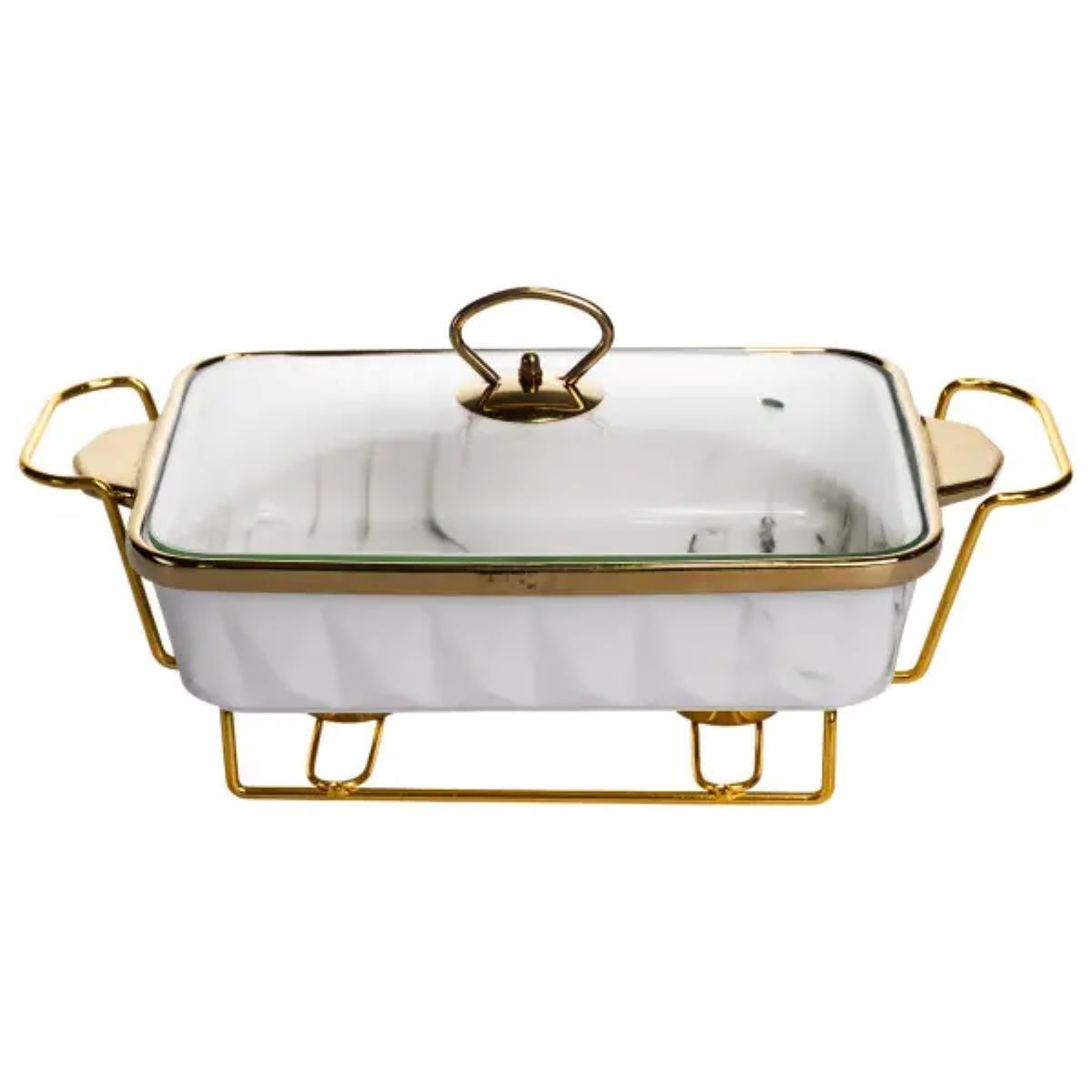 Мармітниця має прямокутну форму з білої порцеляни. Уздовж верхнього краю розташоване золоте оздоблення, яке підкреслює контур і додає завершеності. Конструкція встановлена на металевій підставці золотого кольору, що забезпечує стійкість та дозволяє використовувати свічки або пальники для підігріву. Основний матеріал - гладка біла порцеляна з мармуровим візерунком, доповнена золотим обідком по краю. Дизайн стриманий і симетричний, без надмірного декору, що робить виріб універсальним для різних стилів сервірування. Скляна кришка прозора, з металевою ручкою золотого кольору, яка гармонійно поєднується з підставкою та оздобленням. Мармітниця призначена для подачі гарячих страв із підтриманням їхньої температури. Металева підставка дозволяє розмістити підігрівальні елементи, а скляна кришка зберігає тепло й аромат, водночас даючи змогу бачити вміст. Порцеляна стійка до високих температур і легко очищується після використання, що робить виріб практичним у щоденному застосуванні та під час святкових подій.