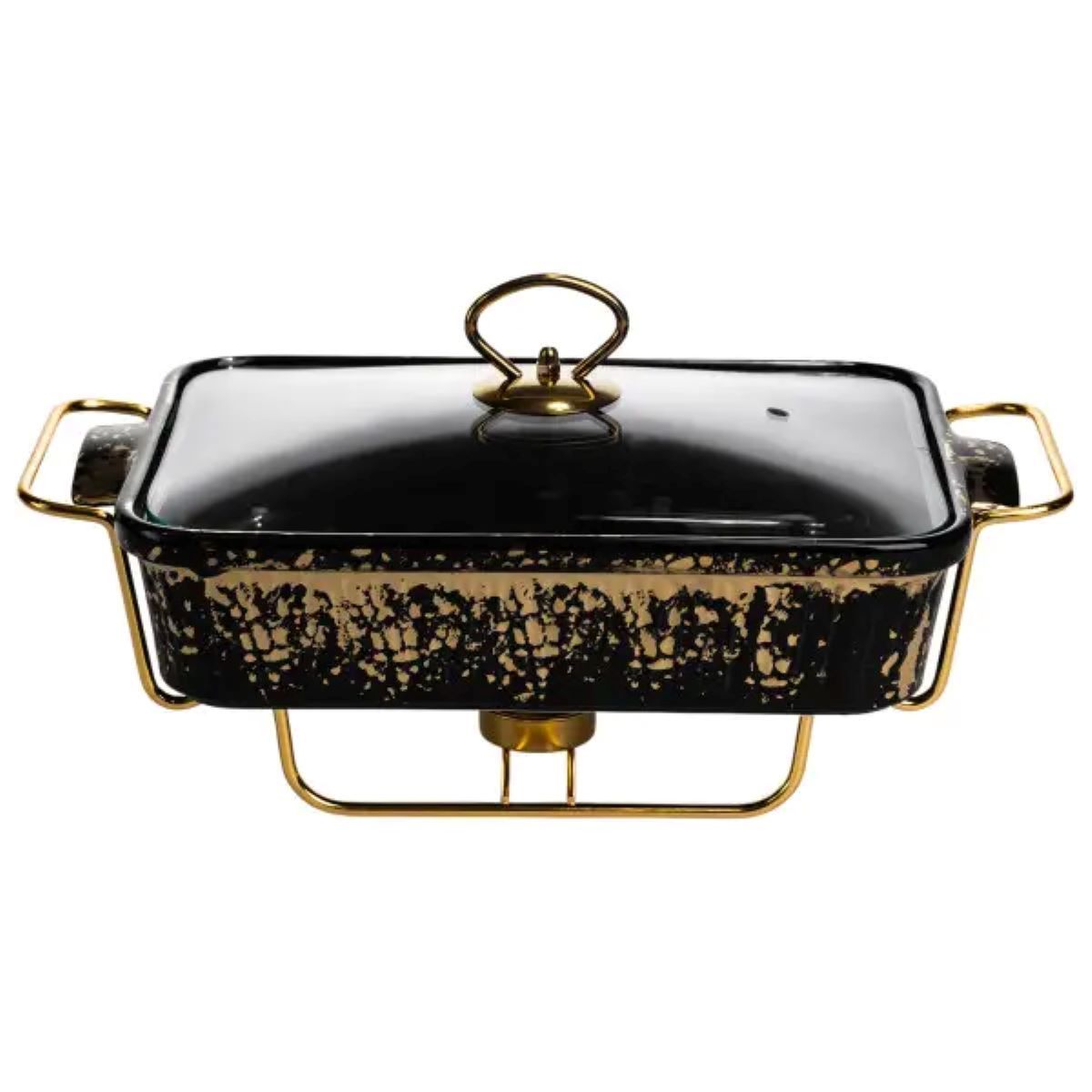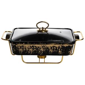 Мармітниця має прямокутну форму та виготовлена з порцеляни чорного кольору з декоративним золотистим вкрапленням по поверхні. Такий дизайн підходить для сервірування гарячих страв під час банкетів, фуршетів або сімейних подій. Порцеляна забезпечує збереження температури та підходить для подачі різних видів страв. Виріб укомплектований прозорою скляною кришкою з металевою ручкою, що дозволяє контролювати вміст без відкривання. Кришка щільно прилягає, допомагаючи мінімізувати втрати тепла та підтримувати охайний вигляд подачі протягом усього часу використання. Мармітниця встановлена на металевій підставці золотистого кольору з підігрівом від свічок-таблеток. Такий тип нагріву не потребує електроживлення та забезпечує рівномірне підтримання температури. Конструкція підставки стійка та розрахована на багаторазове використання.