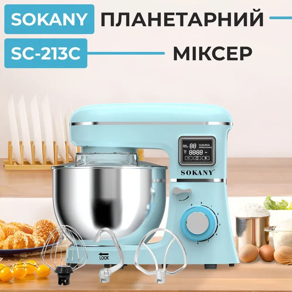 Миксер планетарный с чашей из нержавеющей стали 1800 Вт 6 режимов скорости и 3 насадки Sokany SK-277 (SK277)