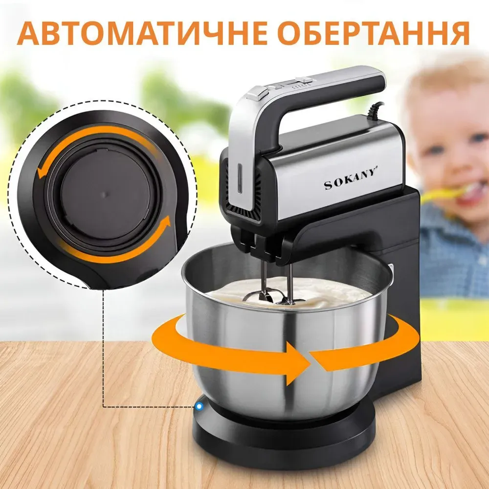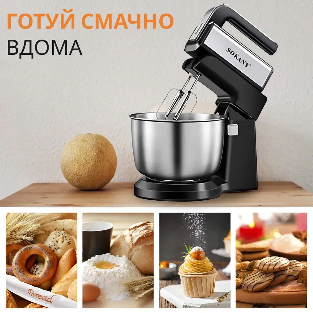 Миксер стационарный с чашей из нержавеющей стали 5 режимов скорости и 2 насадки Sokany CX-6652 (CX6652B)