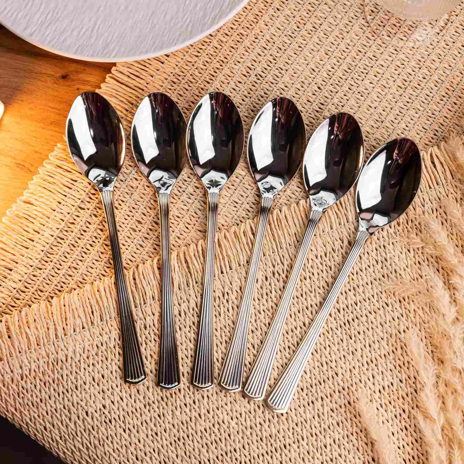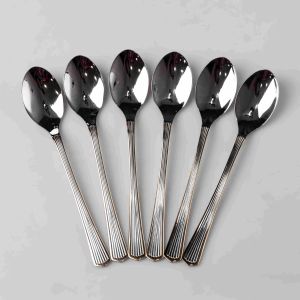 Набір чайних ложок із дзеркальним поліруванням підійде для повсякденного використання та сервірування десертів на святковому столі. Особливості: Матеріал: Нержавіюча сталь. Сплав стійкий до корозії, не впливає смак напоїв і десертів, зберігає форму під час використання. Дзеркальний фініш: Глянцева поверхня надає приборам святкового вигляду та полегшує очищення після використання. Компактний розмір: Довжина 14,5 см оптимальна для чайних та кавових пар, а також для подачі десертів, йогуртів та закусок у невеликих піалах. Догляд: Прибори підходять для регулярного миття посудомийної машини. Характеристики: Матеріал: нержавіюча сталь Довжина: 14,5 см Вага набору: 200 г