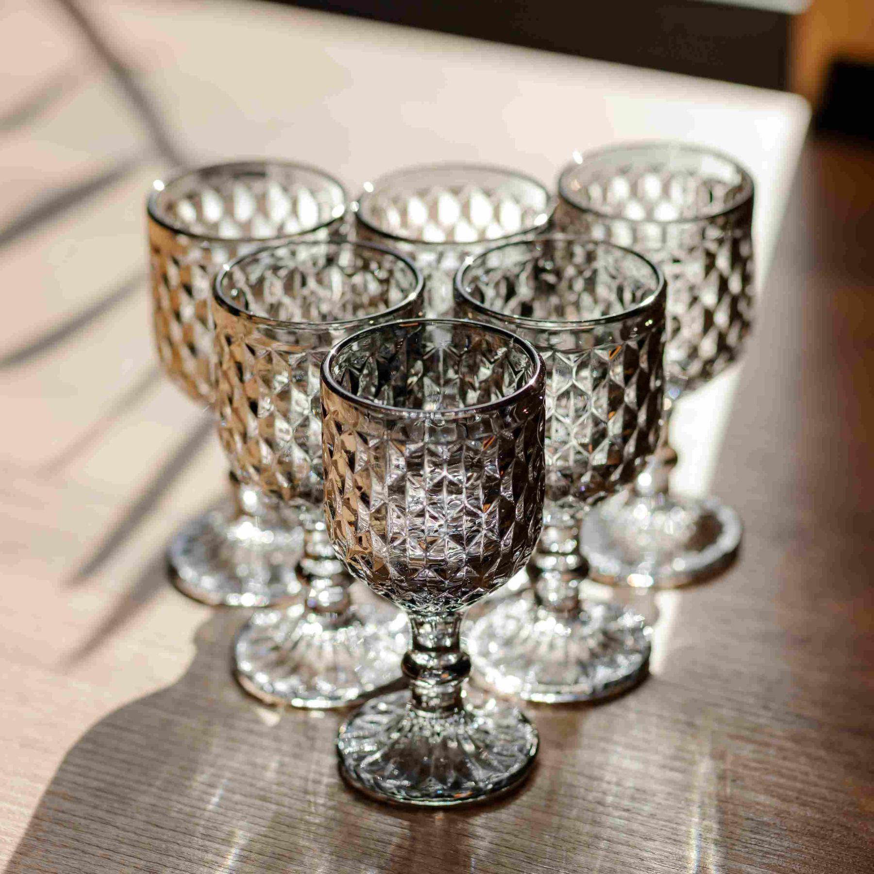 Елегантний набір чарок у графітовому кольорі з виразною алмазною гранню. Стильний аксесуар для сервірування столу, який відмінно поєднується із сучасним посудом та доповнює подачу міцних напоїв. Особливості: Фактурний дизайн: Глибокий рельєфний візерунок по всьому периметру створює гарну гру світла та робить чарки стійкими у руці. Графітовий відтінок: Темне тоноване скло виглядає солідно та сучасно. Практична форма: Зручна ніжка і чаша, що розширюється, роблять використання комфортним. Характеристики: Матеріал: скло Об'єм: 50 мл Висота: 10 см Діаметр: 4,5 см Вага: 800 г