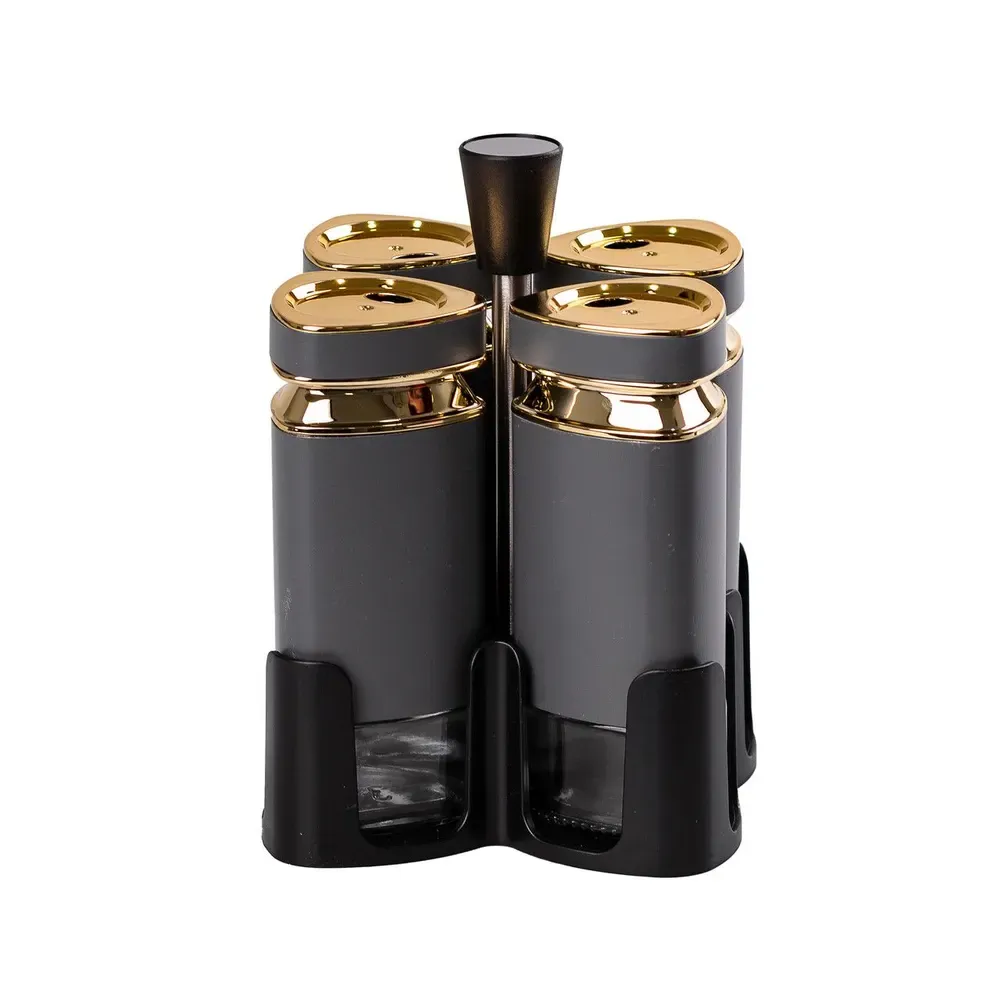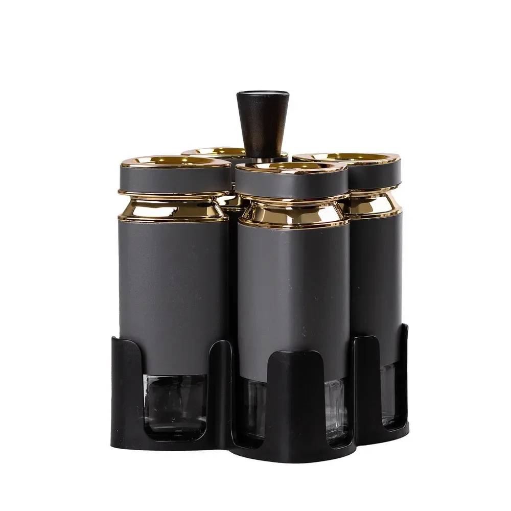 Набор содержит четыре элегантных контейнера для специй, умело размещенных на эргономичной подставке. . Каждый контейнер идеально подходит для хранения и организации различных специй, трав или приправ, придавая вашим блюдам неповторимый вкус и аромат. Кроме того, эстетический дизайн подставки добавляет элемент стиля и элегантности в ваше кулинарное пространство.