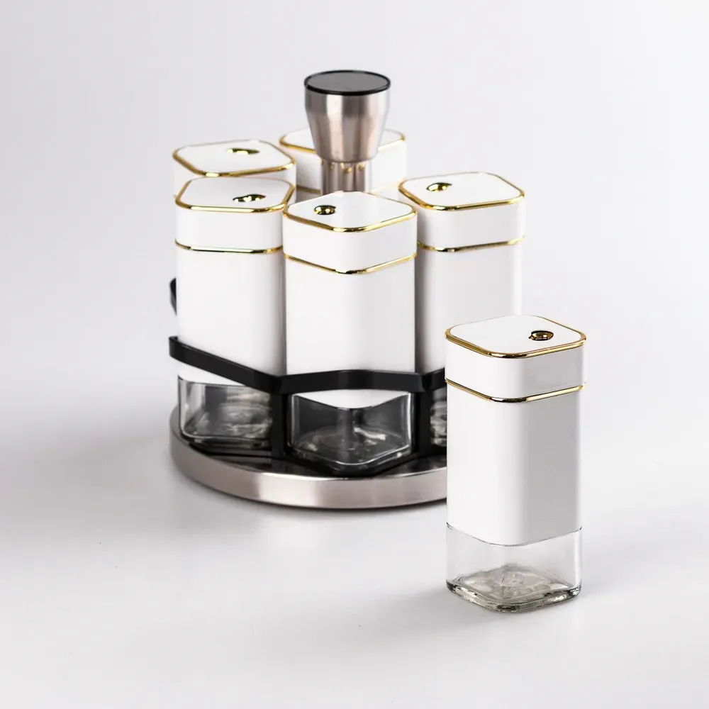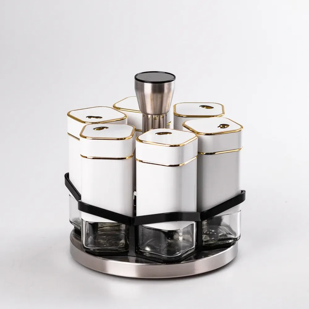 Этот изысканный и практичный набор для специй не только обеспечивает вам все необходимые приправы для приготовления ваших любимых блюд, но и придает вашей кухне элегантный вид.