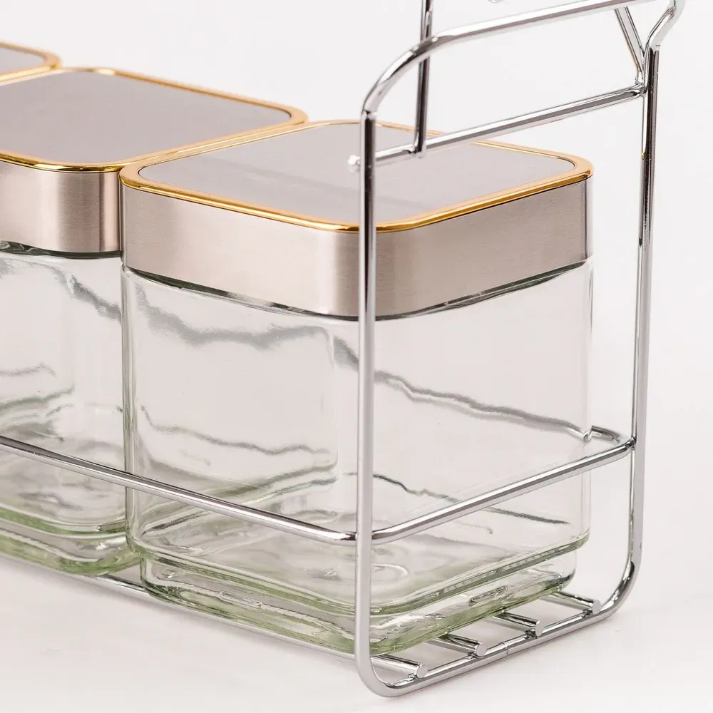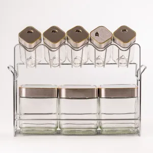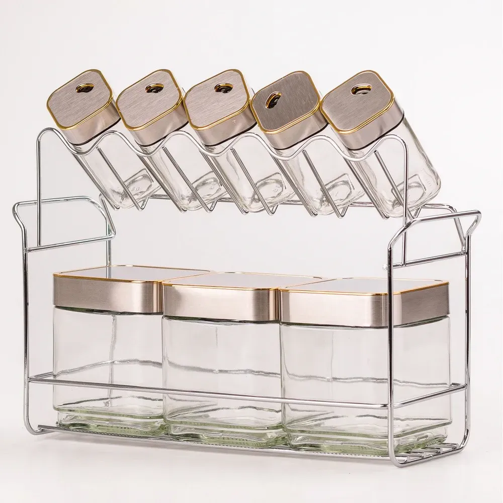Набор для специй на подставке включает в себя 8 стеклянных прозрачных баночек с хромированными герметичными крышечками и дозаторами.