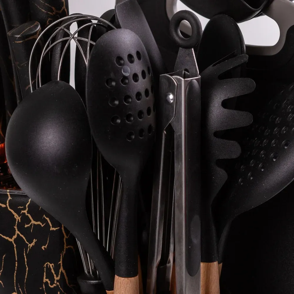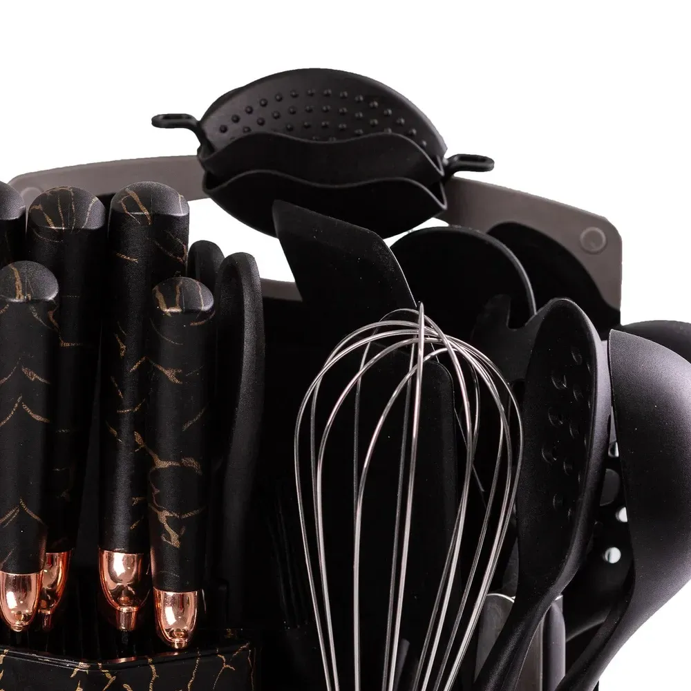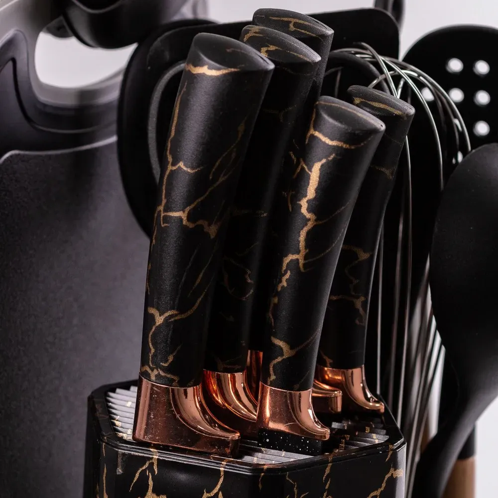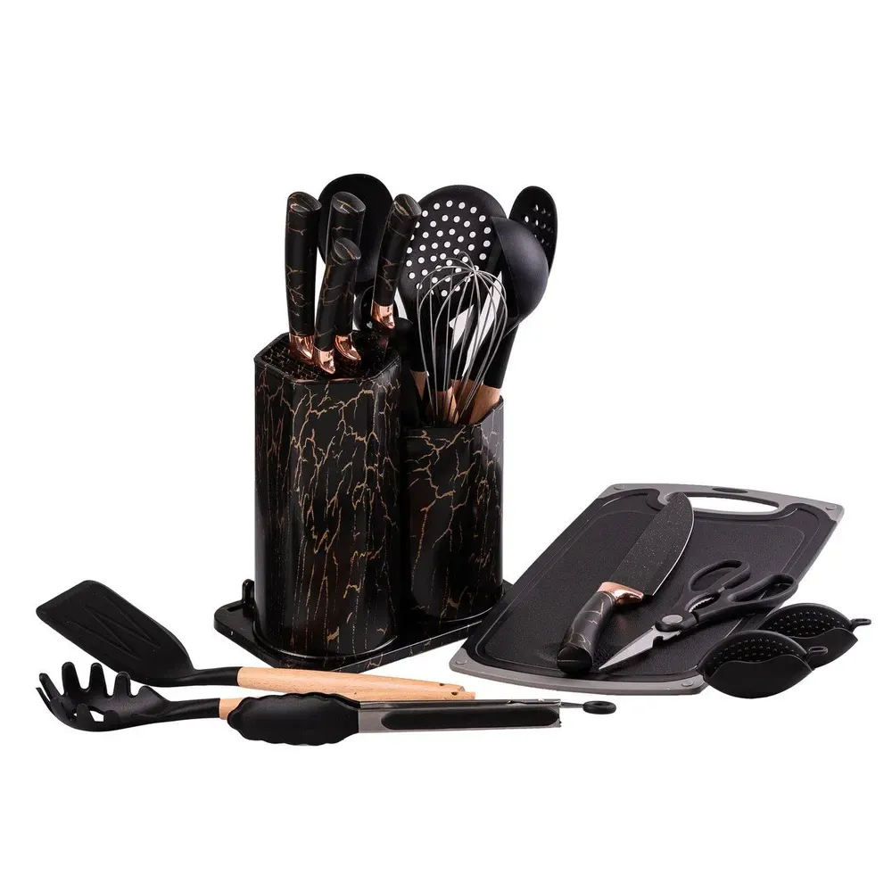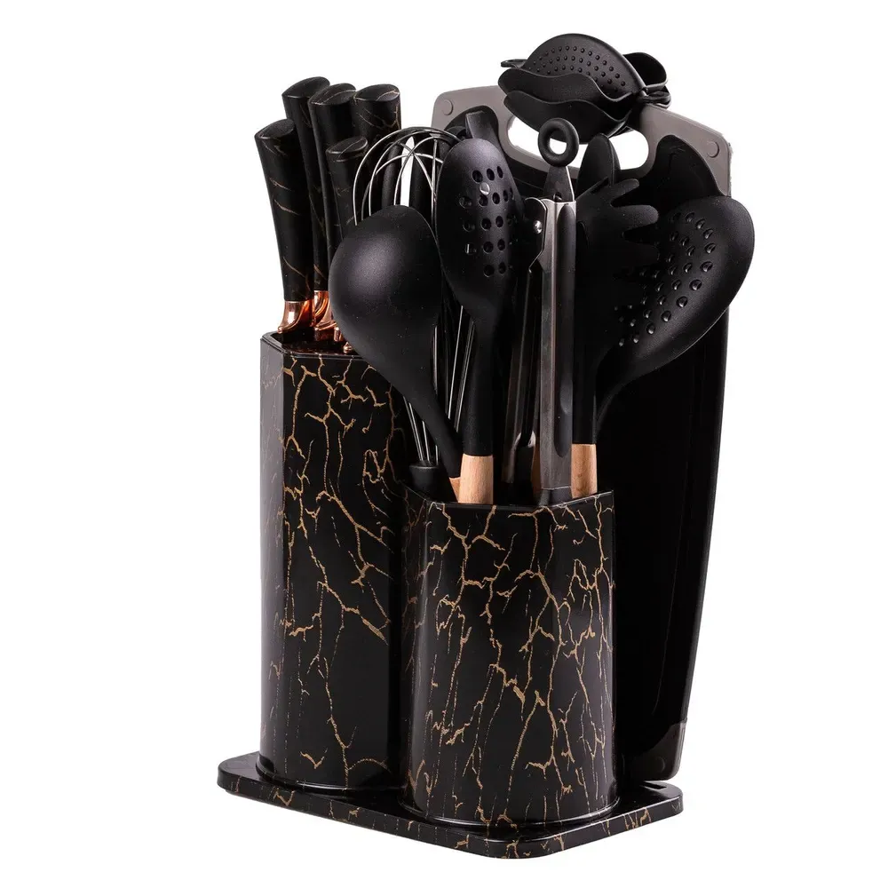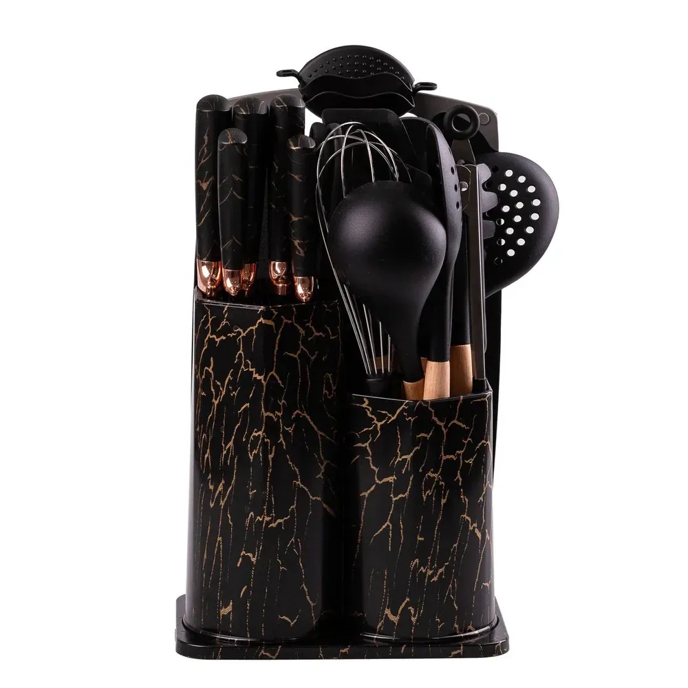 Набор кухонных принадлежностей и ножей на подставке состоит из 25 предметов, изготовленных из высококачественной нержавеющей стали, пластика и бамбука.