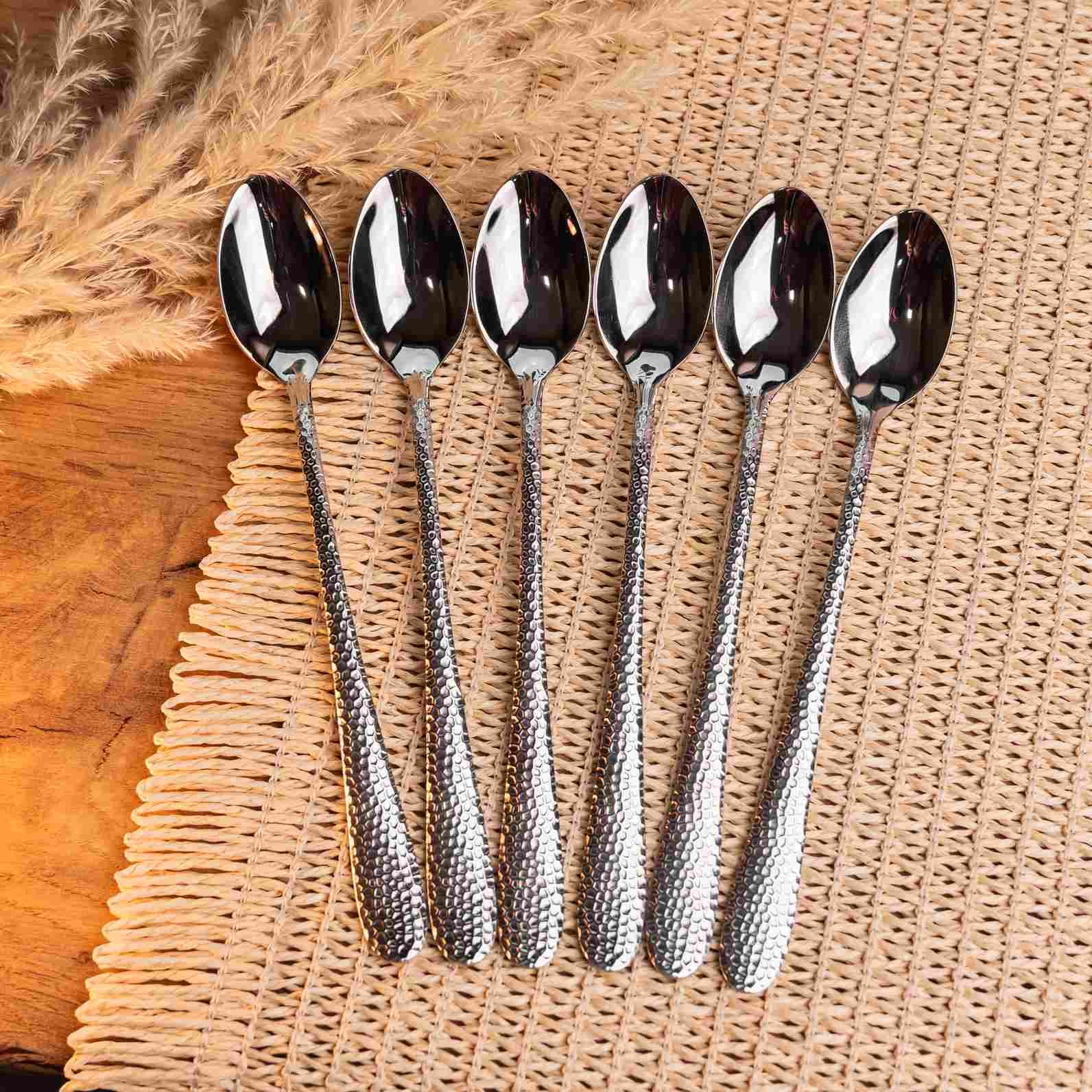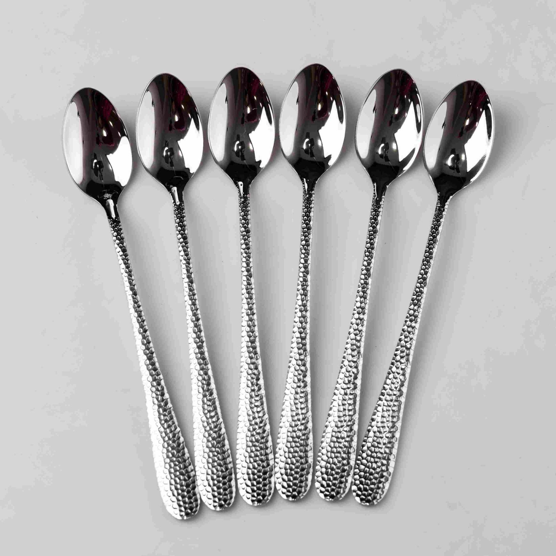 Столові прибори з подовженою ручкою призначені для подачі напоїв та десертів у високому посуді. Дизайн відрізняється характерною «карбованою» фактурою (hammered effect), що створює гру відблисків на світлі. Особливості: Матеріал: Нержавіюча сталь. Стійка до корозії, впливу температур та фруктових кислот. Зберігає блиск при контакті з гарячими та холодними напоями. Подовжена форма: Рукоятка завдовжки 19 см дозволяє комфортно використовувати ложку у високих склянках для латте, келихах для коктейлів, глибоких креманках або банках з десертами. Фактурний дизайн: Поверхня рукояті має рельєфне оздоблення, що імітує сліди ручного кування. Це не лише надає приладам індивідуальності, а й робить їх менш слизькими в руці. Дзеркальне полірування: Робоча частина (черпак) має бездоганно гладке глянсове покриття, що забезпечує гігієнічність та естетичний зовнішній вигляд. Практичність: Прилади мають збалансовану вагу, не гнуться та підходять для щоденного використання. Допускається миття в посудомийній машині. Характеристики: Матеріал: нержавіюча сталь Довжина: 19 см Вага набору: 300 г