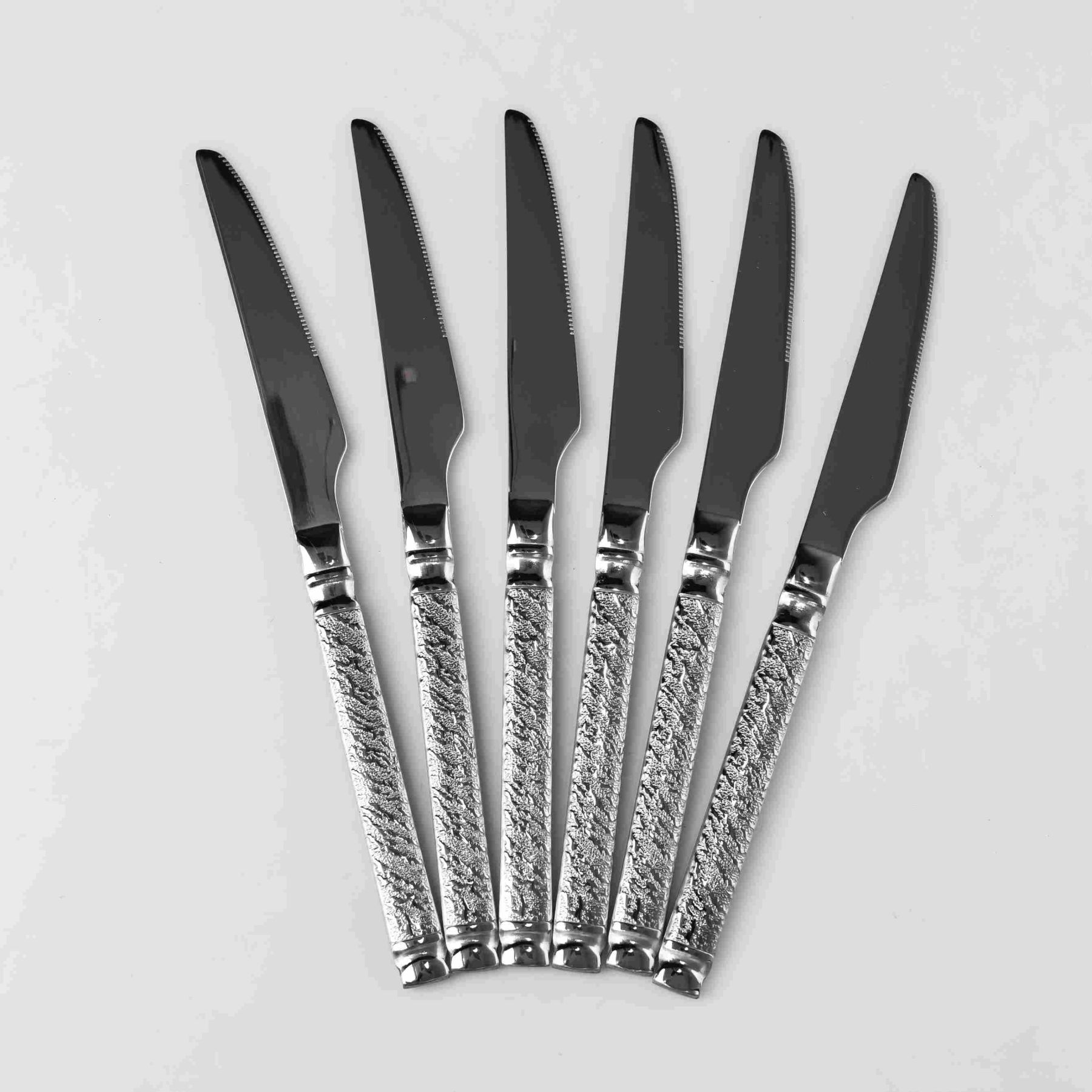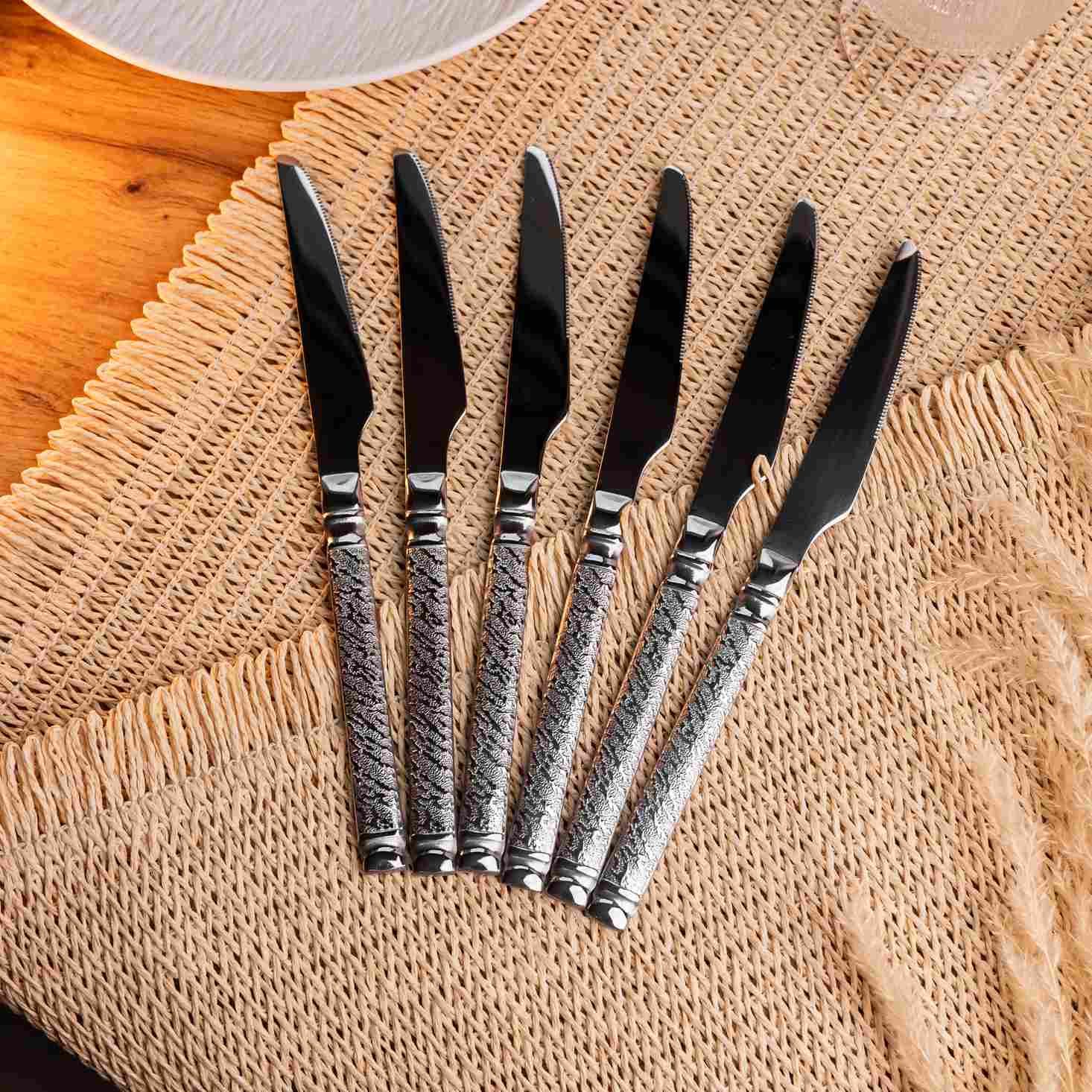 Спеціалізовані столові ножі із серрейторним заточуванням, призначені для нарізування готового м'яса, стейків та інших щільних страв. Модель поєднує в собі функціональність різального інструменту та декоративний дизайн рукояті. Особливості: Матеріал: Нержавіюча сталь із підвищеною стійкістю до затуплення. Лезо зберігає гостроту при контакті з твердими поверхнями тарілок. Серрейторне заточення: Гострий зубчатий край дозволяє легко розрізати волокна м'яса, не змінюючи його, що критично для збереження соковитості стейка. Повнорозмірний формат Довжина 23 см забезпечує оптимальний баланс і важіль, необхідний для комфортного розрізання великих порцій м'яса. Характеристики: Матеріал: нержавіюча сталь Довжина: 23 см Вага набору: 400 г