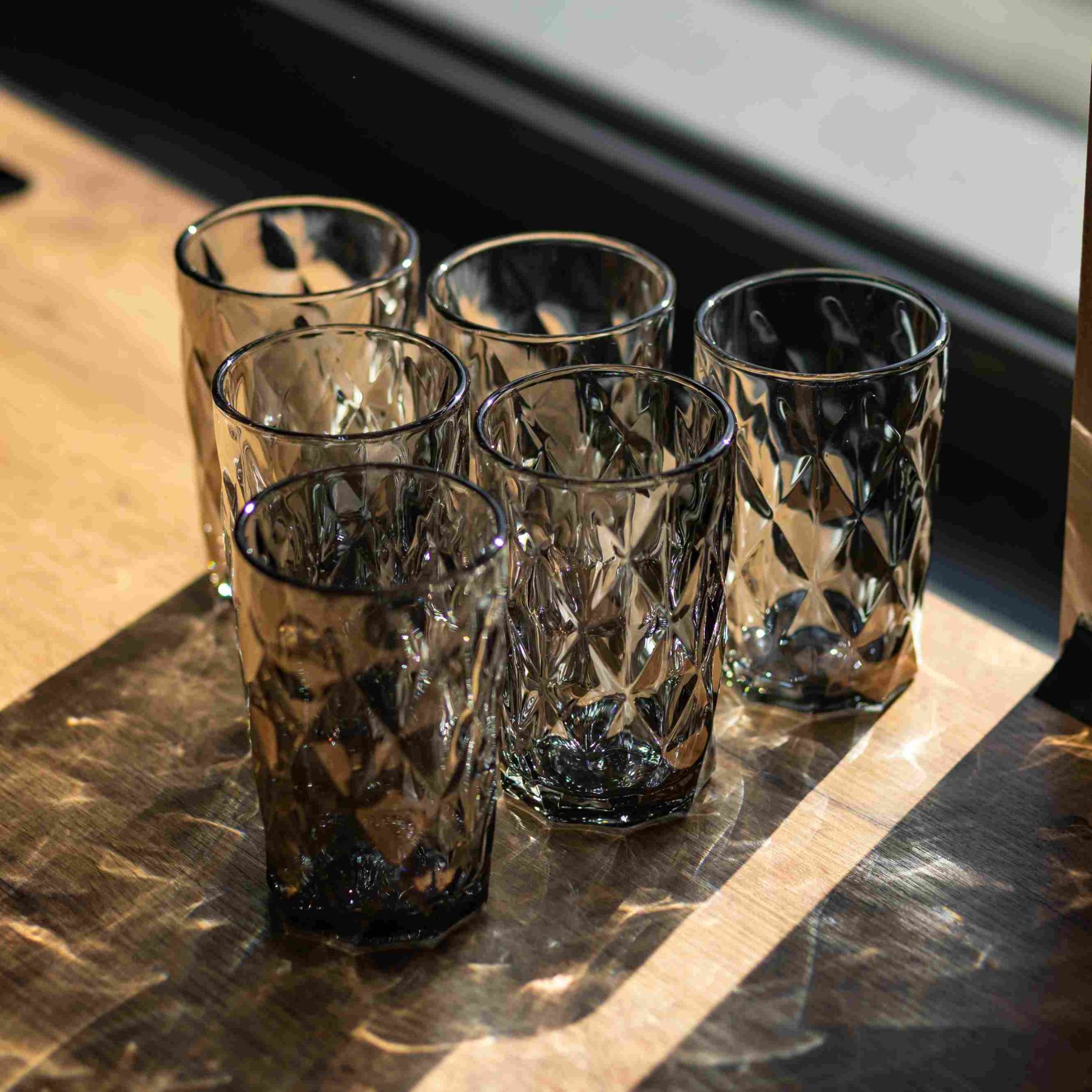 Набір із 6 стильних склянок по 300 мл – ідеальний вибір для повсякденного використання та святкових застіль. Переваги: Універсальність: підходить для соків, води, прохолодних напоїв та коктейлів. Зручність у використанні: міцне дно та зручна форма роблять склянки стійкими та приємними в руці. Естетика: грані створюють ефект гри світла, додаючи столу глибину та стиль. Практичність: легко мити вручну або в посудомийній машині. Характеристики: Матеріал: скло Об'єм: 300 мл Розмір (діаметр/висота): 7,5/12 см Вага: 2 кг