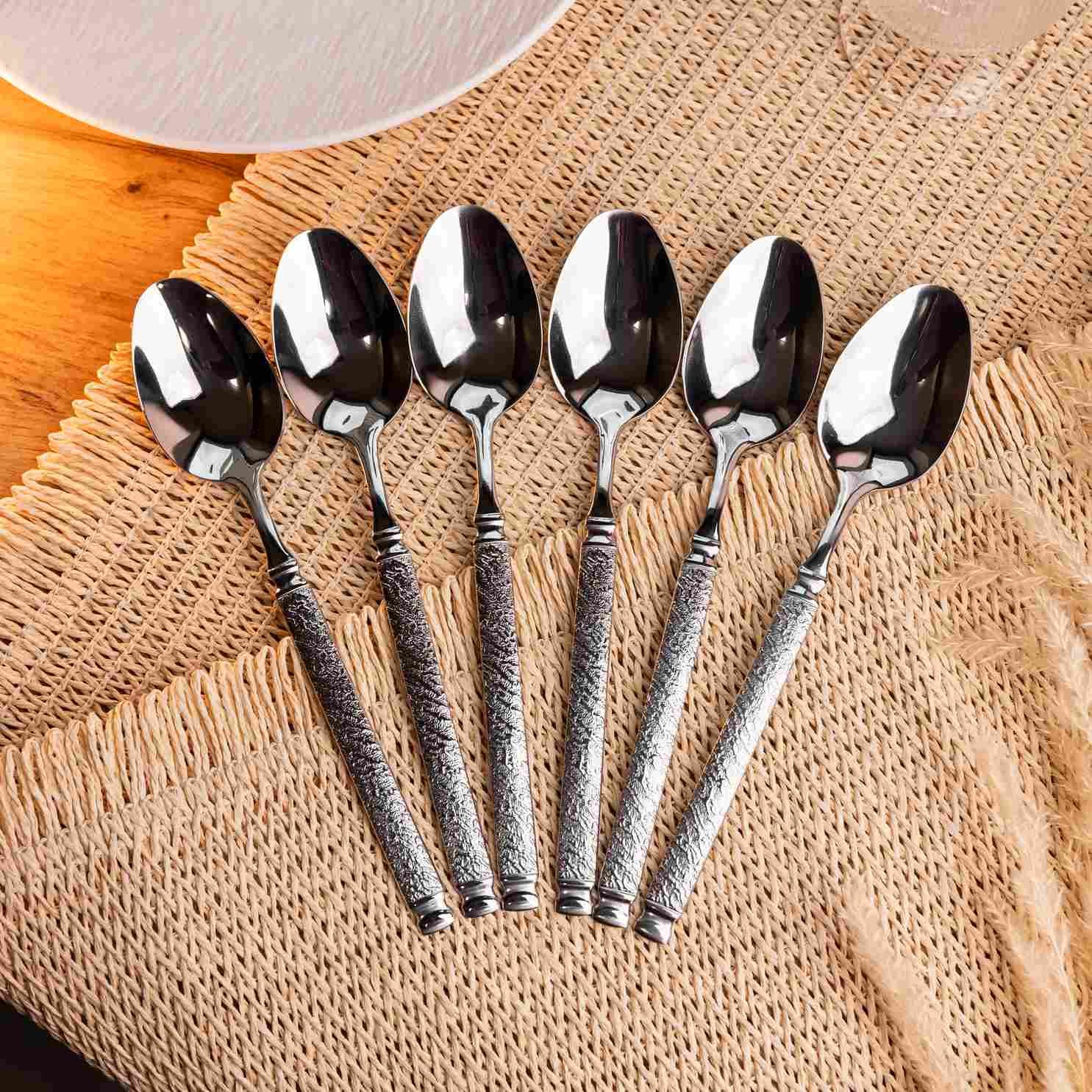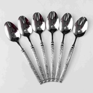 Повнорозмірні столові ложки поєднують строгу геометрію черпака та складну рельєфну текстуру рукояті, що дозволяє використовувати прилади як у сучасному, так і в класичному сервіруванні. Особливості: Матеріал: Нержавіюча сталь. Сплав стійкий до корозії, механічних деформацій та впливу температур. Матеріал не вступає у хімічні реакції з їжею та повністю безпечний при щоденному використанні. Дзеркальне полірування: Робоча частина ложки (черпак) має гладке глянсове покриття. Висока якість полірування полегшує гігієнічний догляд та надає виробам характерного блиску. Фактурна рукоять: Поверхня ручки виконана із застосуванням технології об'ємного тиснення. Рельєфний візерунок, що імітує природну текстуру, забезпечує антиковзкий ефект і робить пристрій зручним для захоплення. Практичність: Зносостійке покриття рукояті стійке до стирання. Прибори підходять для миття в посудомийній машині. Характеристики: Матеріал: нержавіюча сталь Довжина: 21 см Вага набору: 400 г