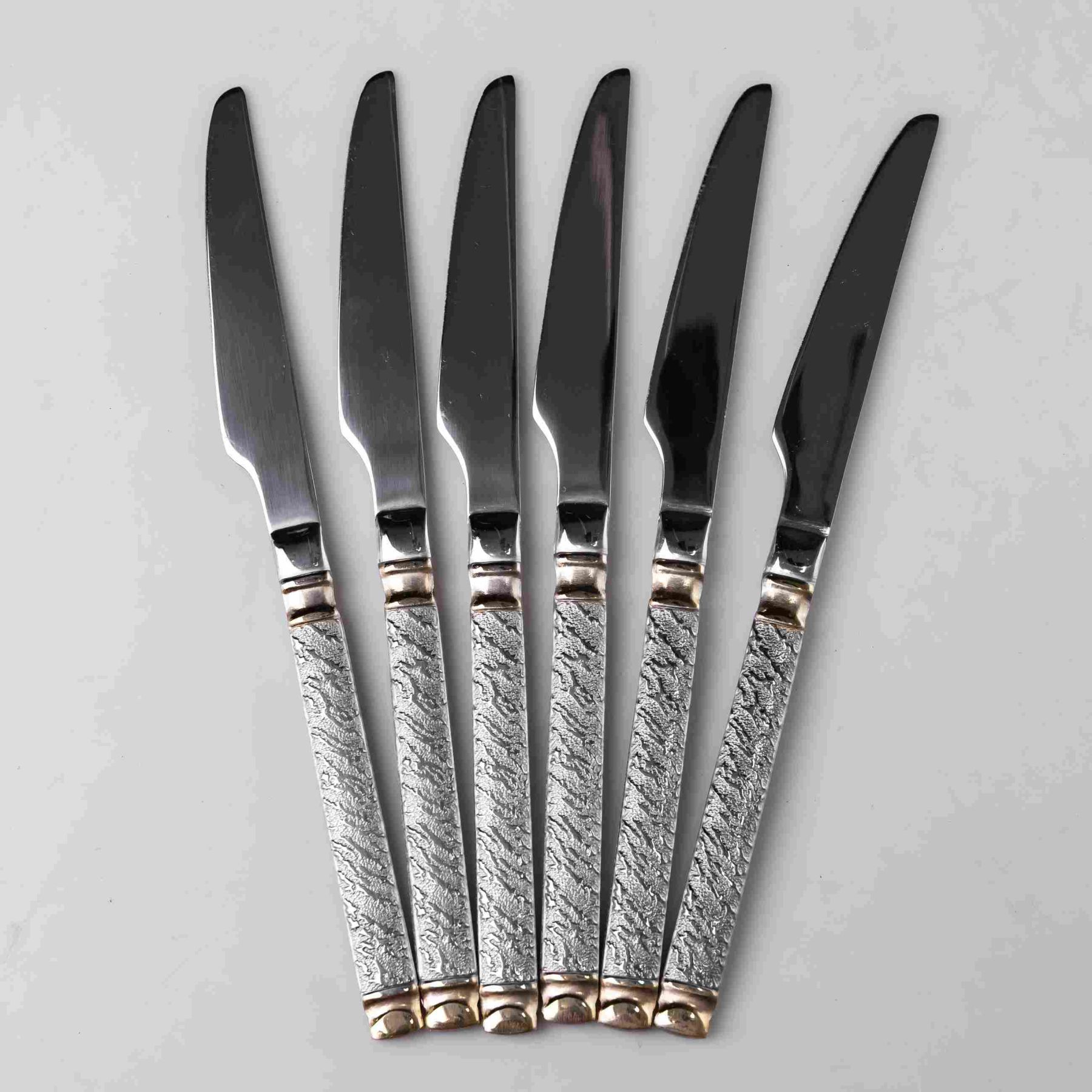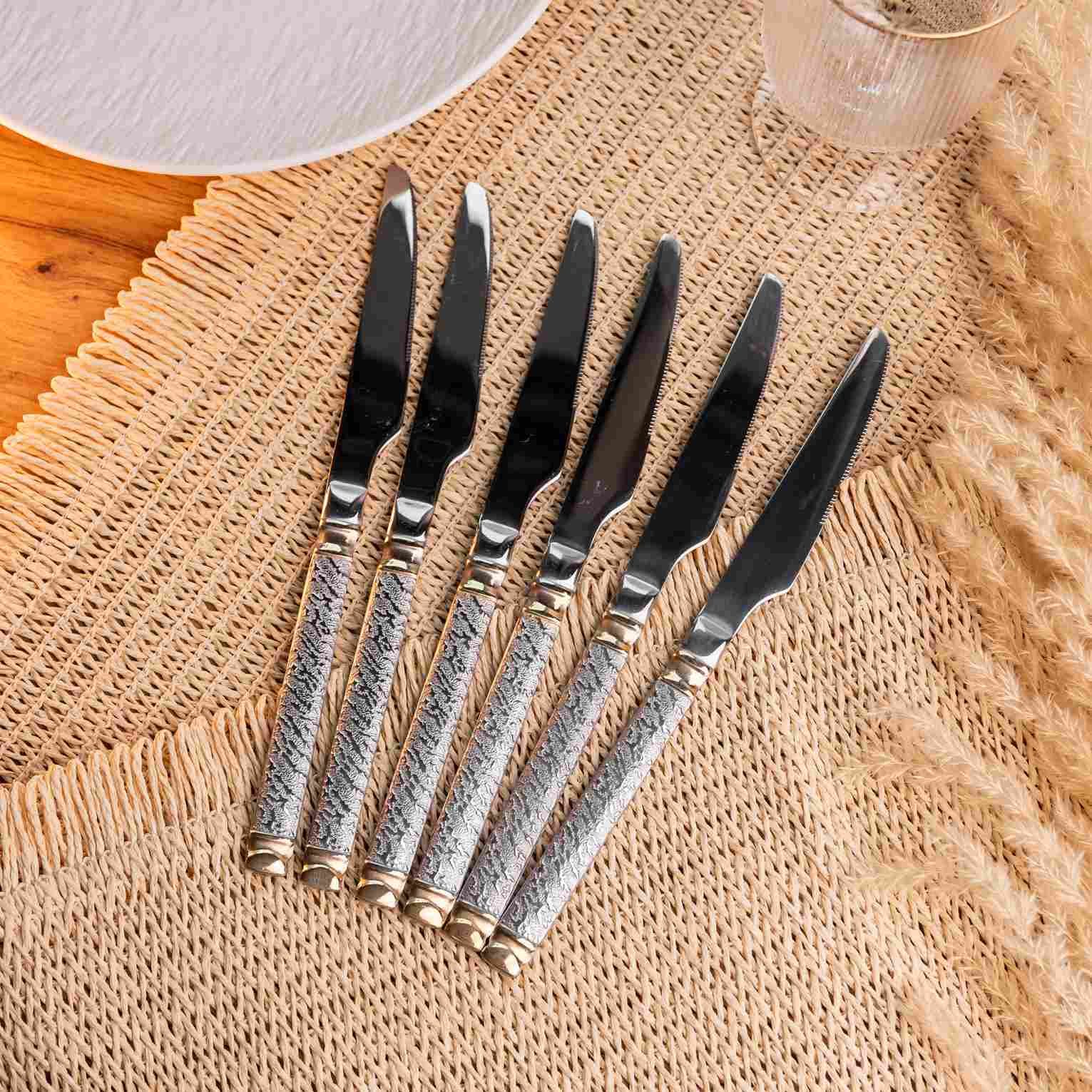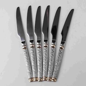 Столові ножі з комбінованим поліруванням та фактурним дизайном рукояті. Належать до категорії повнорозмірних столових приборів, призначених для сервірування основних страв. Особливості: Матеріал: Нержавіюча сталь високої щільності. Сплав стійкий до затуплення, корозії та впливу харчових кислот. Лезо: Ножі мають класичну форму з плавно закругленим кінчиком і дрібнозубчастим заточенням (серрейтором) на кромці для легкого нарізання м'ясних страв і овочів. Розмір: Довжина прибора складає 23 см, що забезпечує зручний важіль для нарізки щільних продуктів. Характеристики: Матеріал: нержавіюча сталь Довжина: 23 см Вага набору: 400 г