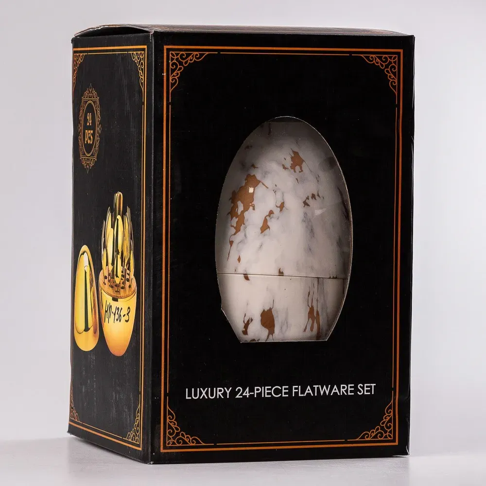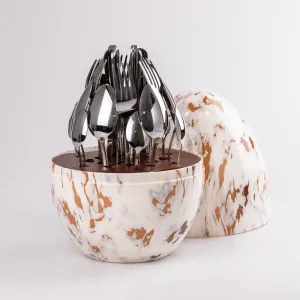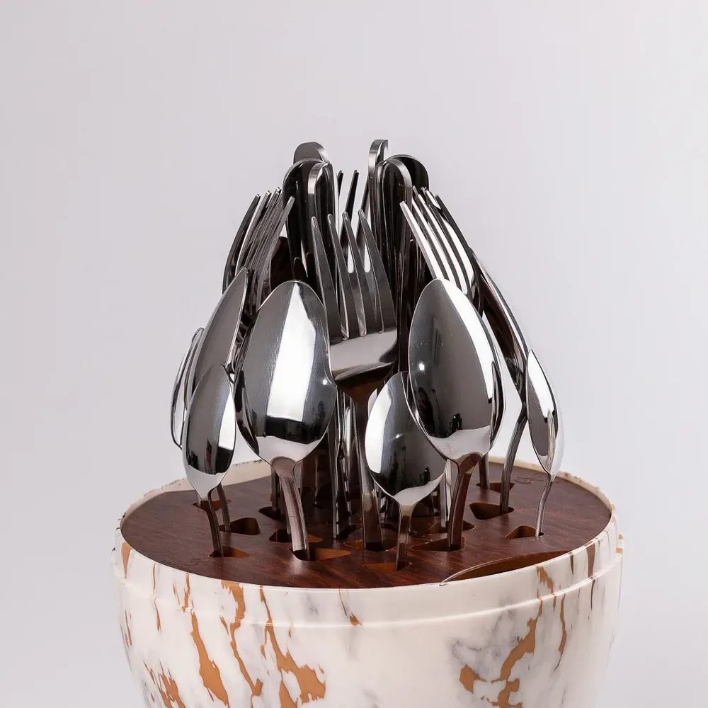 Этот набор столовых приборов из 24 предметов станет стильным и функциональным дополнением к посуде. Он изготовлен из высококачественной нержавеющей стали, которая прочна, устойчива к коррозии и не впитывает запахи. Ручки столовых приборов выполнены из мрамора, что придает им стильный и современный вид.