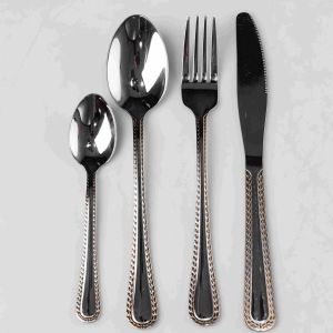 Набір столових приборів на 6 персон в елегантному золотому виконанні. Дизайн відрізняється витонченим гравірованим візерунком на рукоятях, що надає набору класичного урочистого вигляду. Комплектація набору: столові ложки - 6 шт (21,1 см) столові вилки - 6 шт (21 см) столові ножі - 6 шт (22,5 см) чайні ложки - 6 шт (15 см) Особливості: Матеріал: Нержавіюча сталь зі зносостійким напиленням. Матеріал гігієнічний, стійкий до корозії та зберігає свій блиск при правильному догляді. Подарунковий кейс: Набір упакований в елегантну чорну коробку з ложементами для кожного предмета. Це забезпечує безпечне зберігання та робить комплект готовим рішенням для подарунка. Якість обробки: Прибори мають плавні, ретельно відполіровані краї та збалансовану вагу для комфортної трапези. Характеристики: Матеріал: нержавіюча сталь Кількість предметів: 24 Вага набору: 1,9 кг