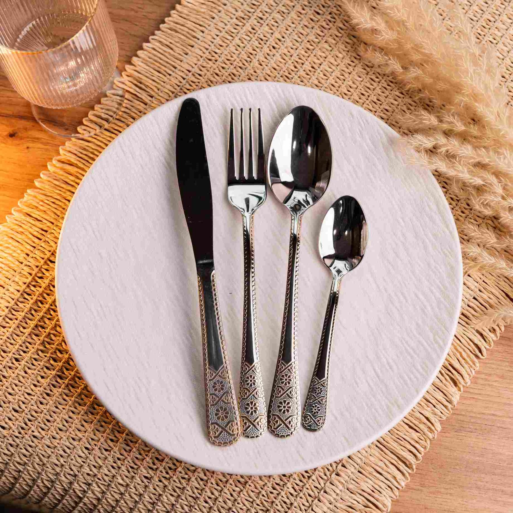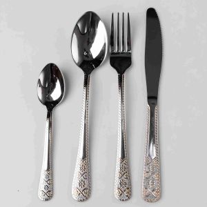 Вишуканий комплект столових приборів, що поєднує класичні форми із багатим декоративним оформленням. Комплектація набору: столові ложки - 6 шт (21,1 см) столові вилки - 6 шт (21 см) столові ножі - 6 шт (22,5 см) чайні ложки - 6 шт (15 см) Особливості: Матеріал: Нержавіюча сталь високої якості. Матеріал стійкий до корозії, з часом не деформується і безпечний для щоденного контакту з їжею. Якість обробки: Робочі частини приладів мають бездоганне дзеркальне полірування. Краї ретельно оброблені, що гарантує комфорт та безпеку при використанні. Подарункова упаковка: Набір поставляється у стильному чорному кейсі з внутрішнім ложементом. Кожен предмет надійно зафіксований, що запобігає появі подряпин під час зберігання чи транспортування. Ергономіка: Прибори мають збалансовану вагу і зручну форму рукояток, що звужуються до шийки, що забезпечує надійний хват. Характеристики: Матеріал: нержавіюча сталь Кількість предметів: 24 Вага набору: 1,9 кг
