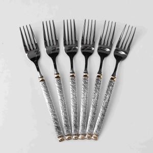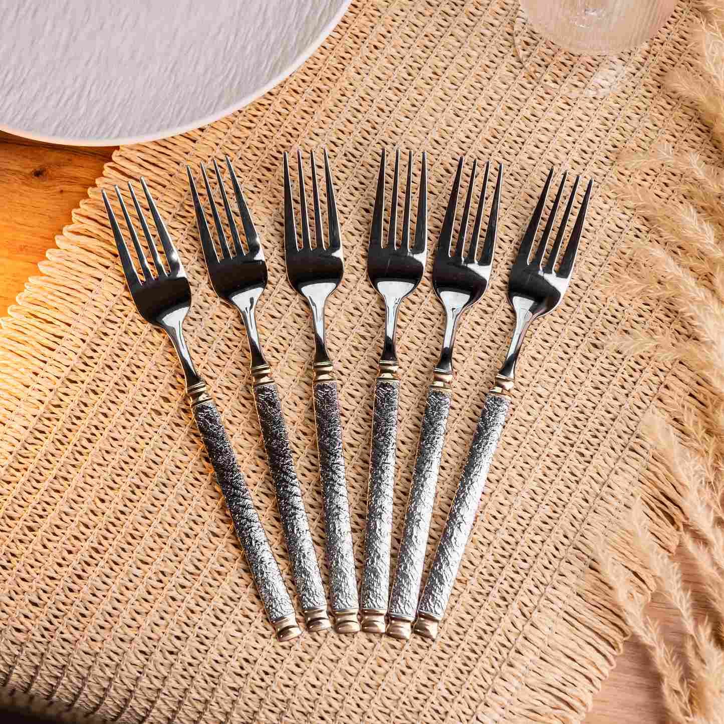Повнорозмірні столові виделки підходять для повсякденного використання та урочистого сервірування. Відрізняються виразною текстурою рукоятей та контрастними декоративними елементами. Особливості: Матеріал: Нержавіюча сталь. Матеріал стійкий до корозії, деформації та впливу органічних кислот, що містяться у продуктах. Робоча частина: Класична чотиризубцева форма із дзеркальним поліруванням. Поверхня ретельно оброблена для забезпечення гладкості та гігієнічності. Фактурна рукоятка: Має складний рельєфний візерунок, нанесений методом об'ємного тиснення. Розмір: Довжина виробу становить 21 см, що забезпечує комфортний баланс та зручність при вживанні основних страв та гарнірів. Характеристики: Матеріал: нержавіюча сталь Довжина: 21 см Вага набору: 200 г