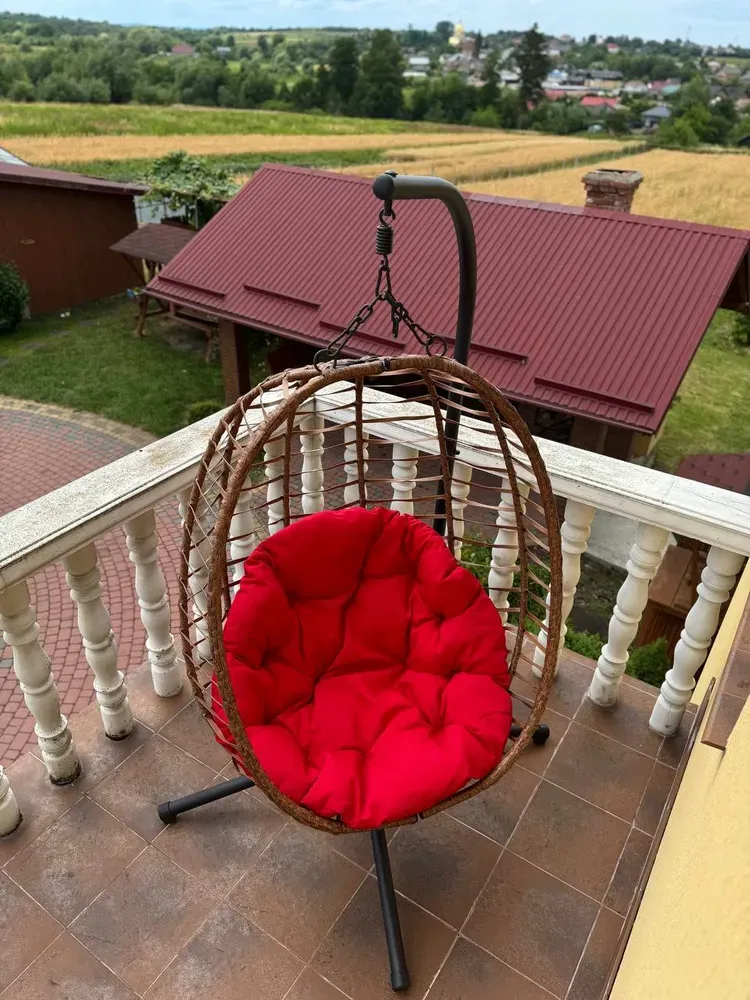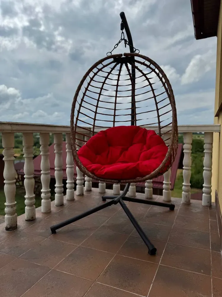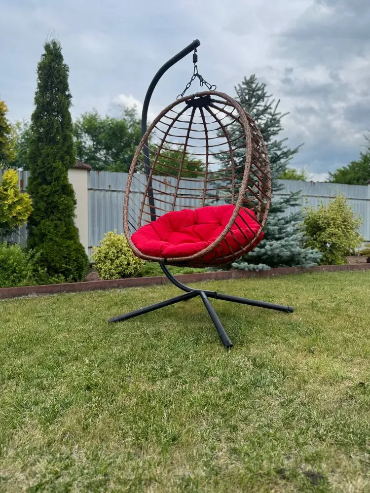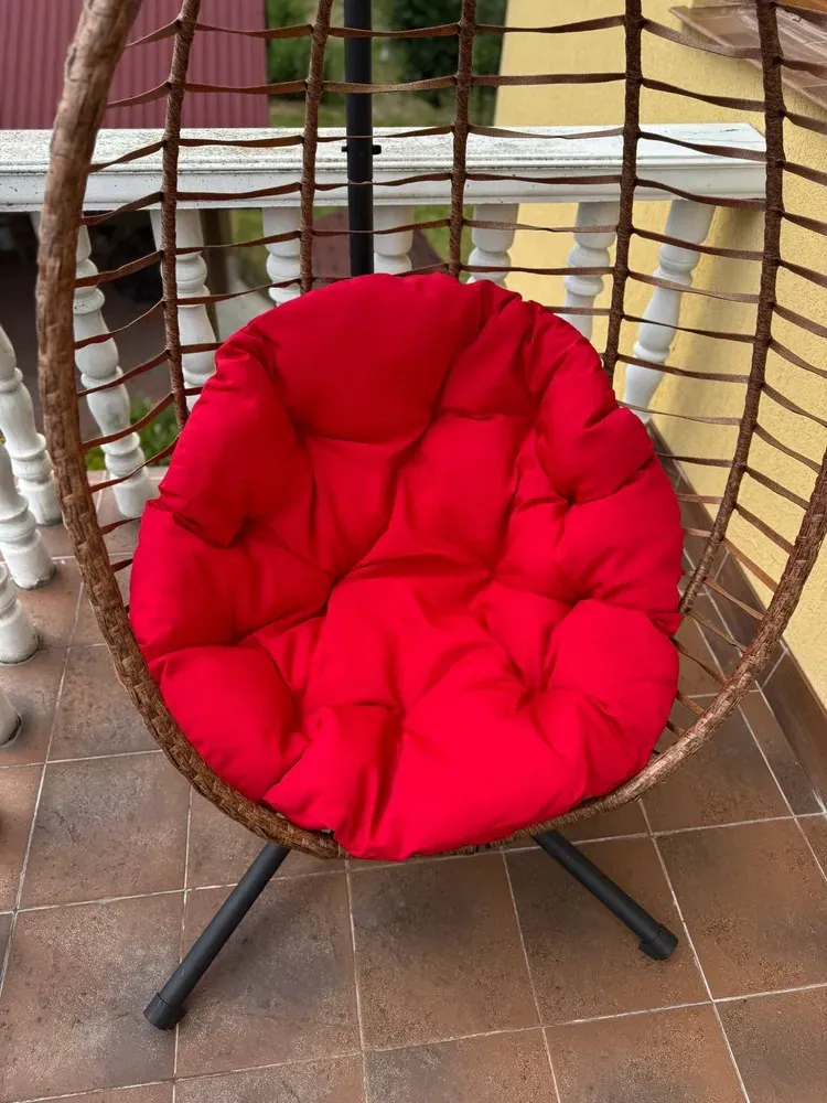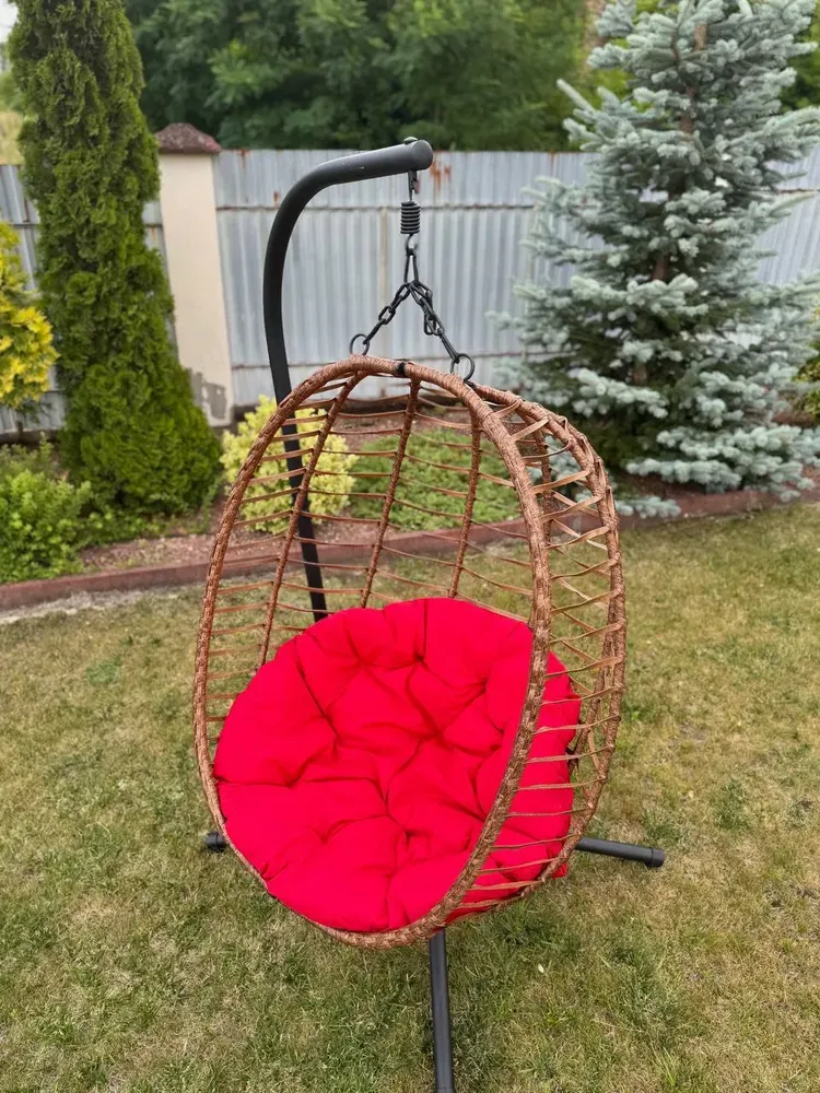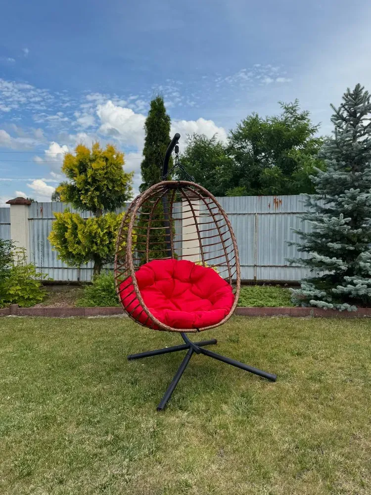 Підвісне крісло - ідеальне рішення для тих, хто шукає комфорт та відпочинок у сучасному стилі. Наше крісло відрізняється унікальним дизайном, що поєднує функціональність та естетику. Безперечно, на естетику та комфорт впливає велика гарна подушка червоного кольору. Чорне крісло із подушкою якравого кольору виглядає надзвичайно стильно. Міцна та стійка конструкція на 4 ніжках привносить атмосферу сучасності. Великою перевагою цього крісла є те, що його можна розкласти на зимовий сезон та зберігати, наприклад, у гаражі, де воно не займе багато місця.
