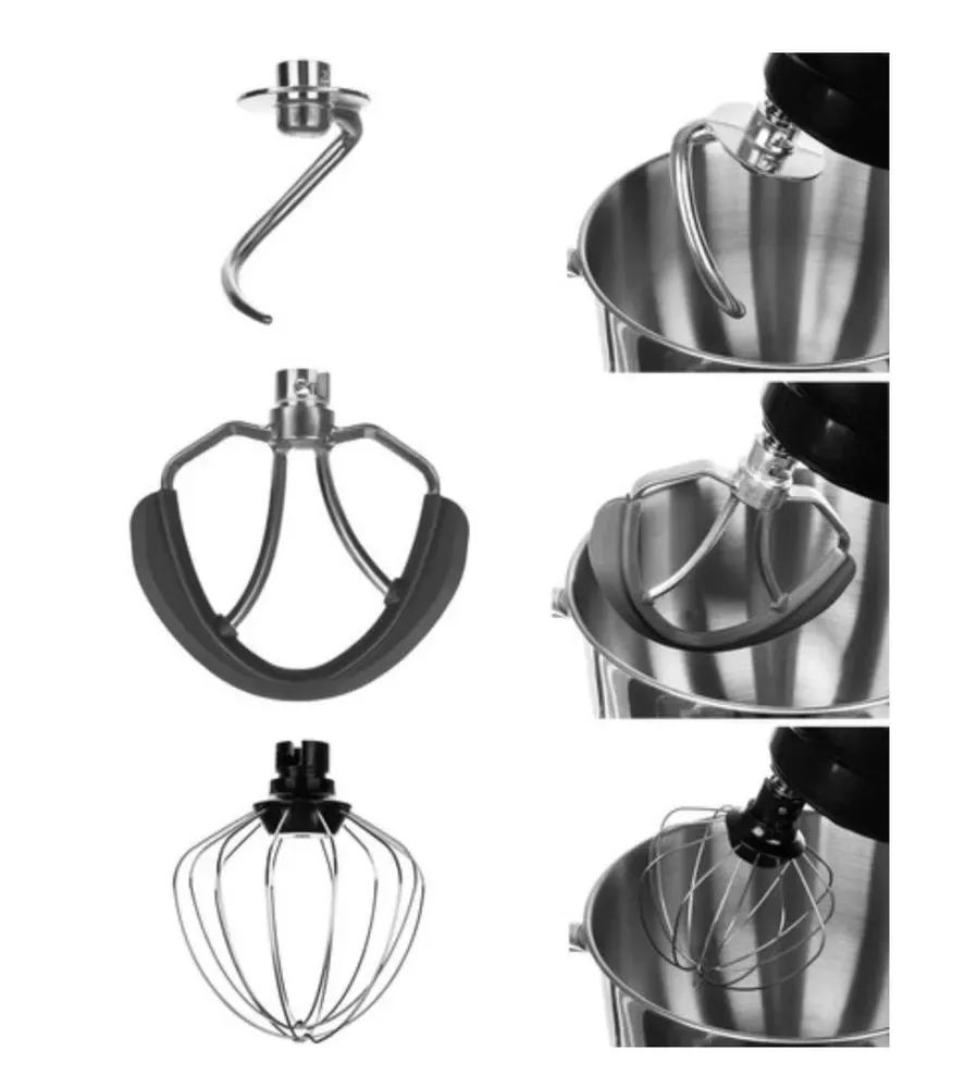 • 3 ТИПЫ НАСАДОК - в набор входят 3 насадки для приготовления пищи. Мешалка с силиконовой насадкой используется для идеального сочетания ингредиентов теста. Крюк предназначен для того, чтобы хорошо вымешивать тесто, например дрожжевое, а венчик - для взбивания легких ингредиентов, таких как взбитые сливки или яичные белки.