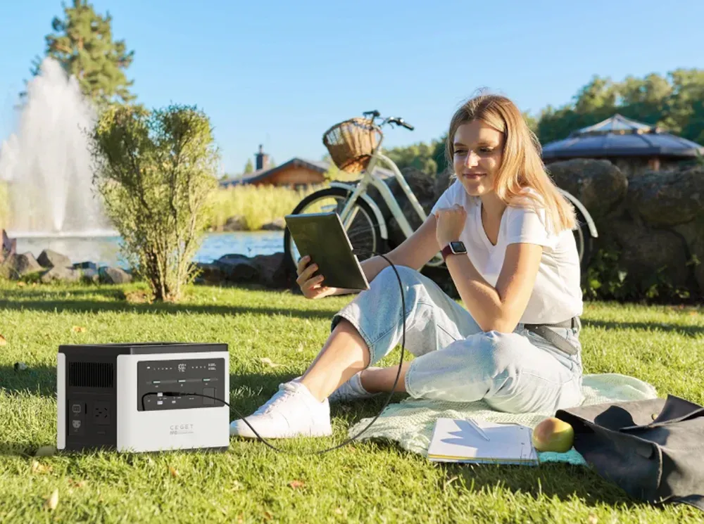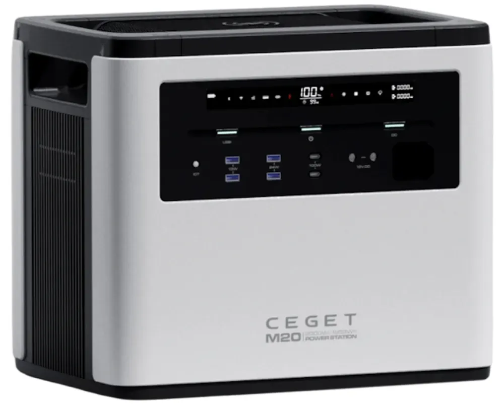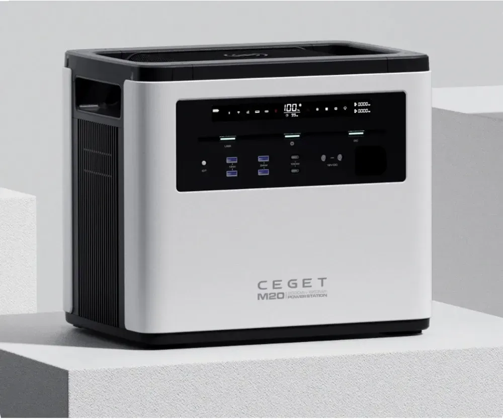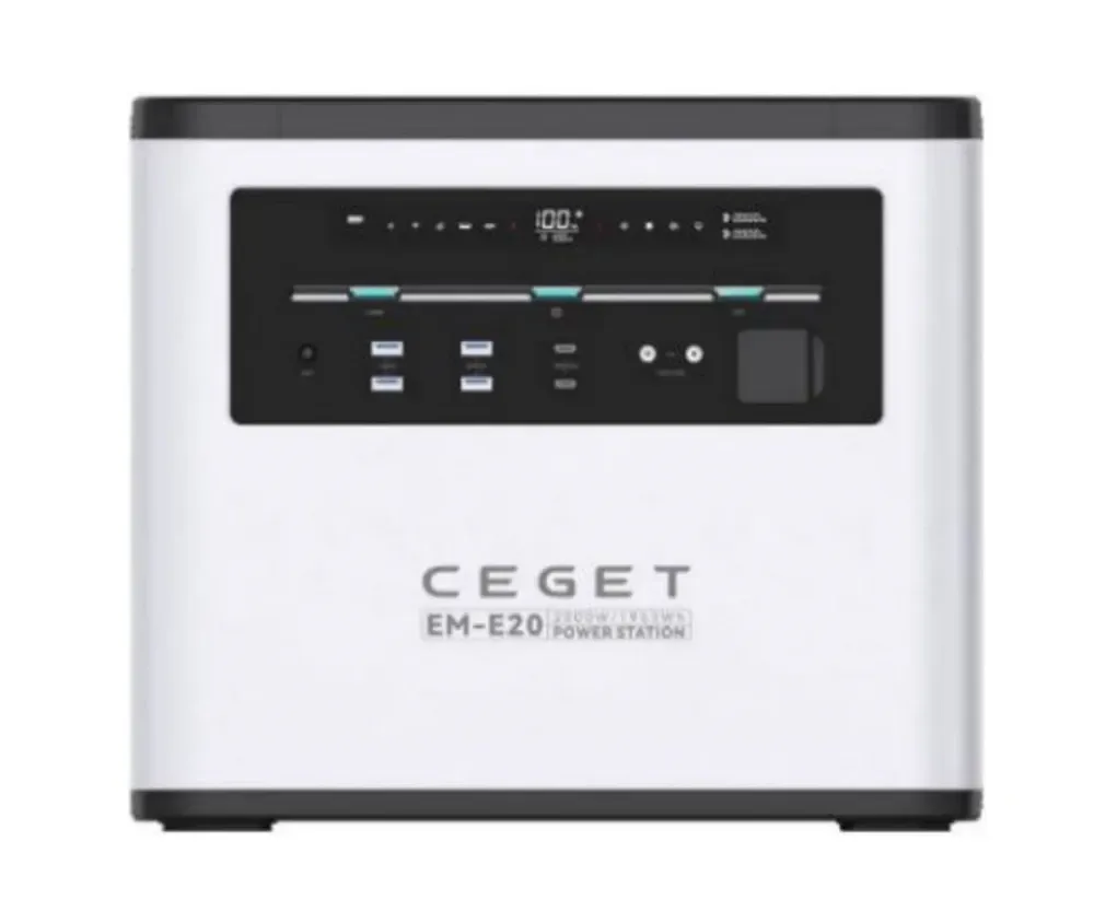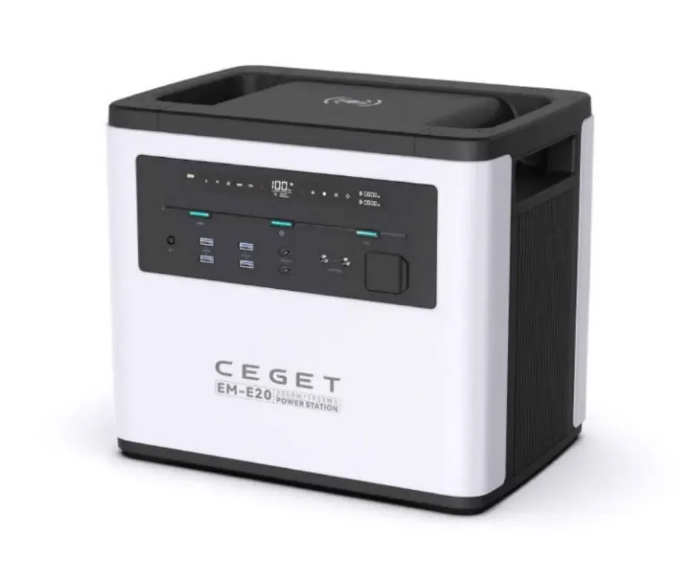 Портативная зарядная станция CEGET EM-M20 2000W - универсальное и высокопроизводительное устройство с LMO аккумулятором (ресурс циклов – 1300 до 80% емкости) номинальной емкостью 1953 Вт-ч 528 000 мА-ч для обеспечения резервного или аварийного питания мощной бытовой техники (кондиционеров, СВЧ печей, блендеров), а также дронов, фотоаппаратов, ноутбуков, смартфонов и планшетов. Электростанция поддерживает беспроводную зарядку, быструю зарядку в течение 1 часа через розетку 180-260 В, также можно зарядить устройство через автомобильный прикуриватель и солнечную панель с максимальной мощностью 800 Вт.