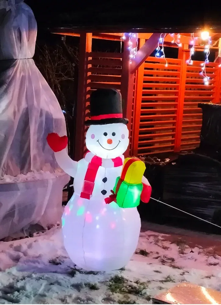 СВЕТИТСЯ - этот уникальный декоративный снеговик со светодиодной подсветкой будет прекрасно выглядеть как в саду, так и дома. Он подчеркнет праздничную атмосферу и привлечет внимание соседей, особенно детей, которые будут знать, что приближается зима. У милого круглого человечка черная шляпа, красный нос и подарки в руке. Он изготовлен из высококачественных водонепроницаемых материалов, гарантирующих безупречный внешний вид на долгие годы.ВСТРОЕННЫЙ КОМПРЕССОР И СВЕТОДИОДНЫЙ ОБРАЩАЮЩИЙСЯ ПРОЕКТОР - снеговик имеет встроенный компрессор, который быстро наполнит его воздухом и придаст ему хороший вид. Дополнительно в украшение встроенный вращающийся светодиодный проектор освещает его изнутри. С наступлением темноты снеговик переливается всеми рождественскими красками. Проектор запрограммирован на 8 чередующихся последовательностей освещения. В КОМПЛЕКТ ВХОДЯТ КОЛЫШКИ, веревки и 2 мешка с ВЕСОМ - снеговик оснащен «системой усиления против неконтролируемых падений». Для стабилизации фигуры используются две петли тесьмы, расположенные на уровне талии, с помощью 4 колышков, закрепленных на 2 стропах. Светящийся снеговик дополнительно обременен двумя мешками с камнями. Мешочки расположены внутри фигурки. оснащена блоком питания, имеющим степень защиты IP44, что делает ее устойчивой к ударам жестких предметов. размером более 1 мм и водонепроницаемой.