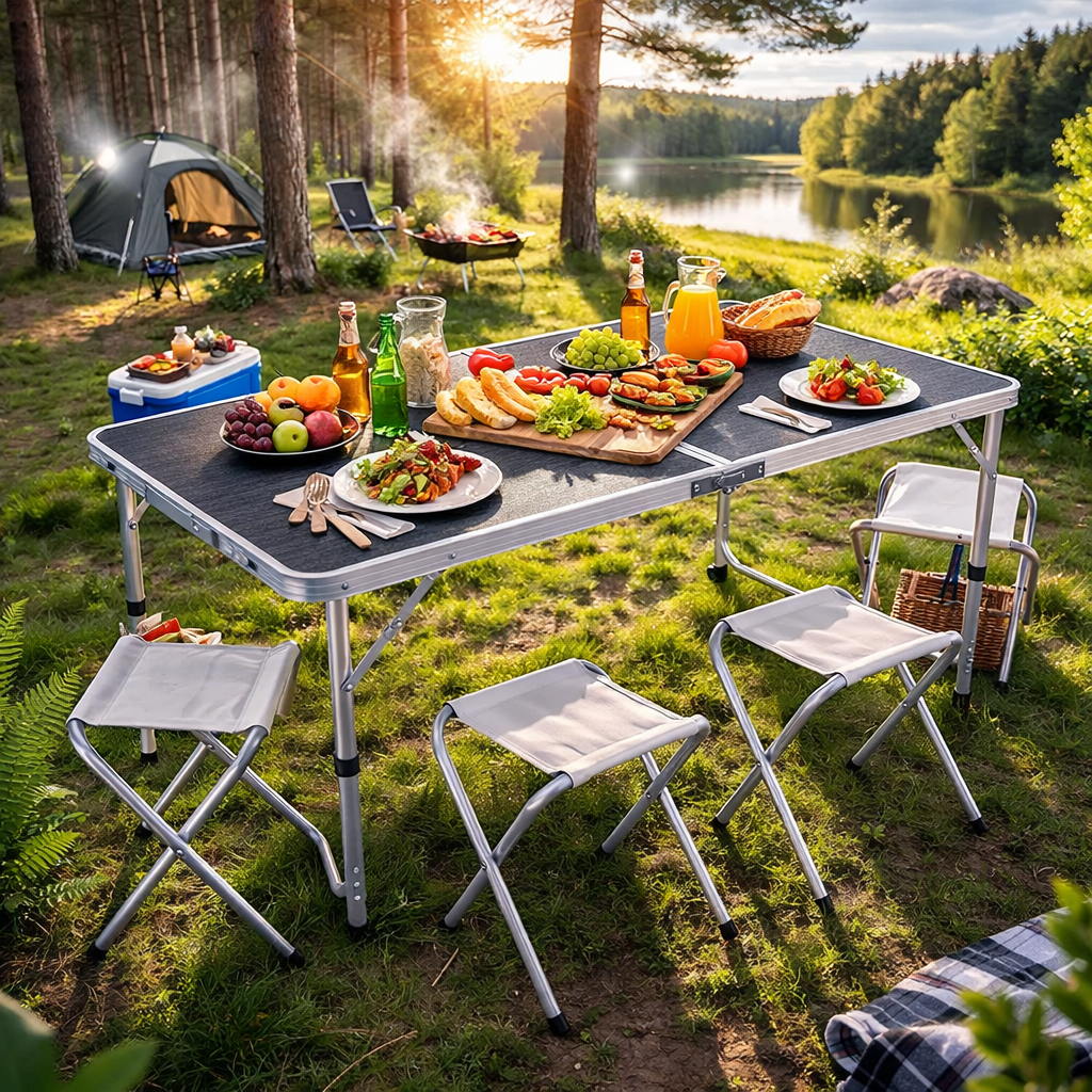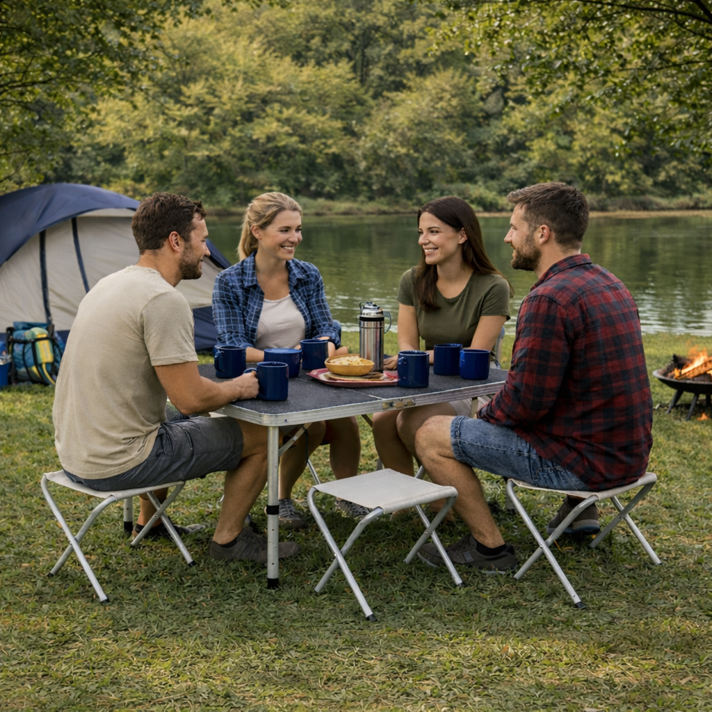 Складний стіл і 4 компактні стільці формують зручний простір для всієї родини або компанії друзів. Чи то сніданок на природі, відпочинок біля озера, риболовля або пікнік — у вас завжди буде комфортне місце для відпочинку.
