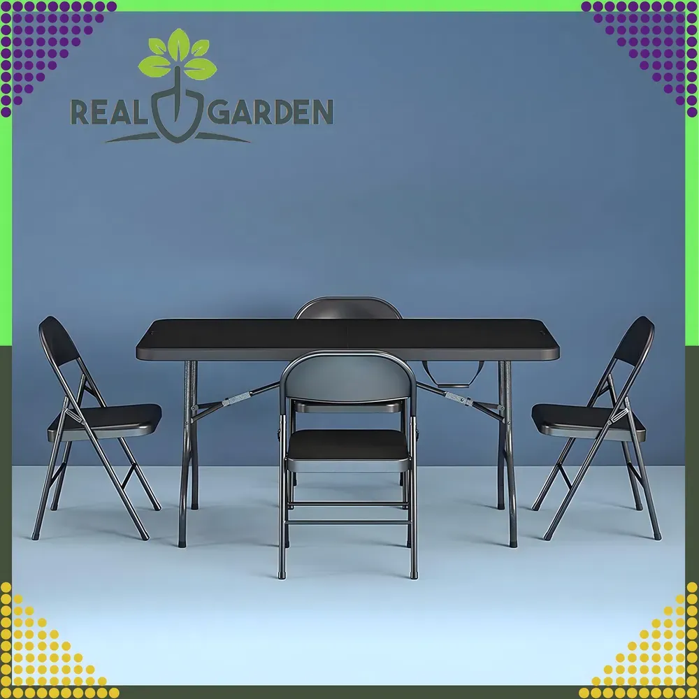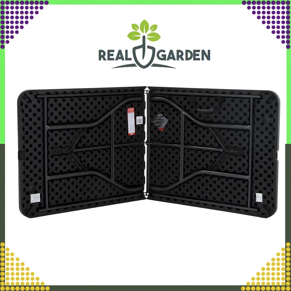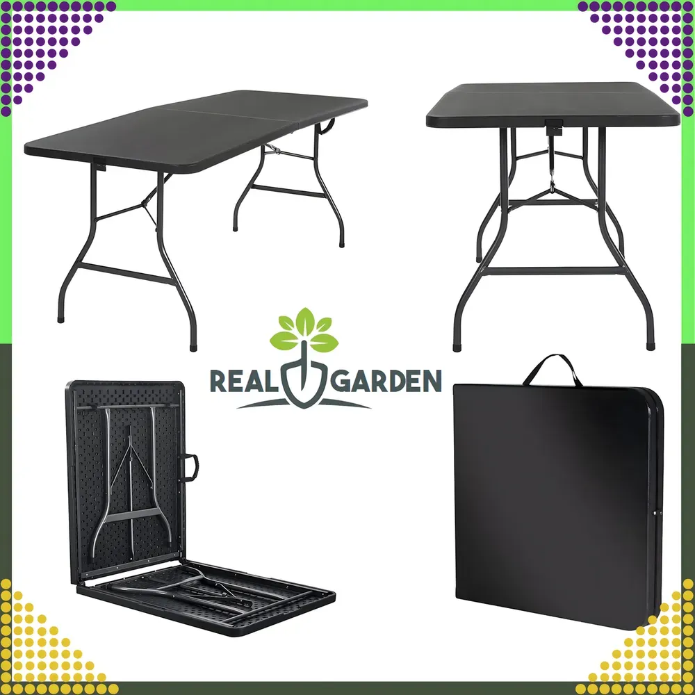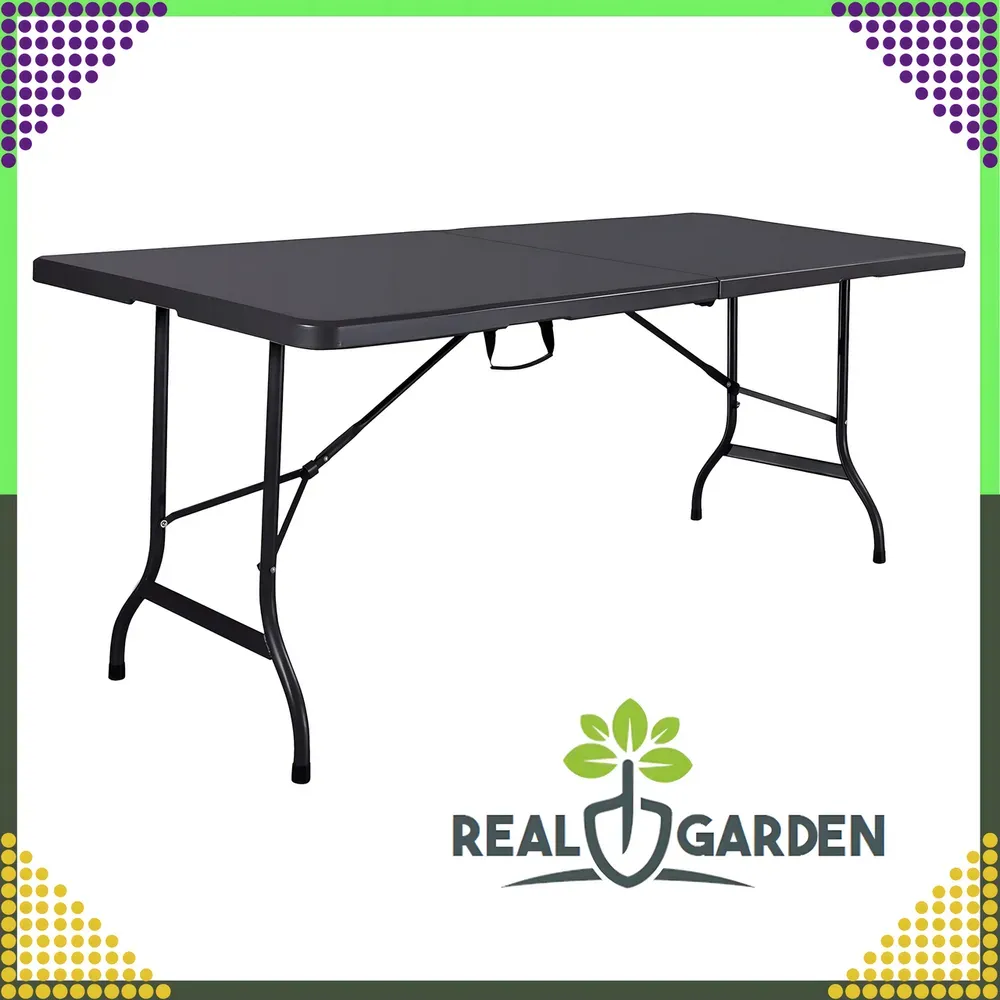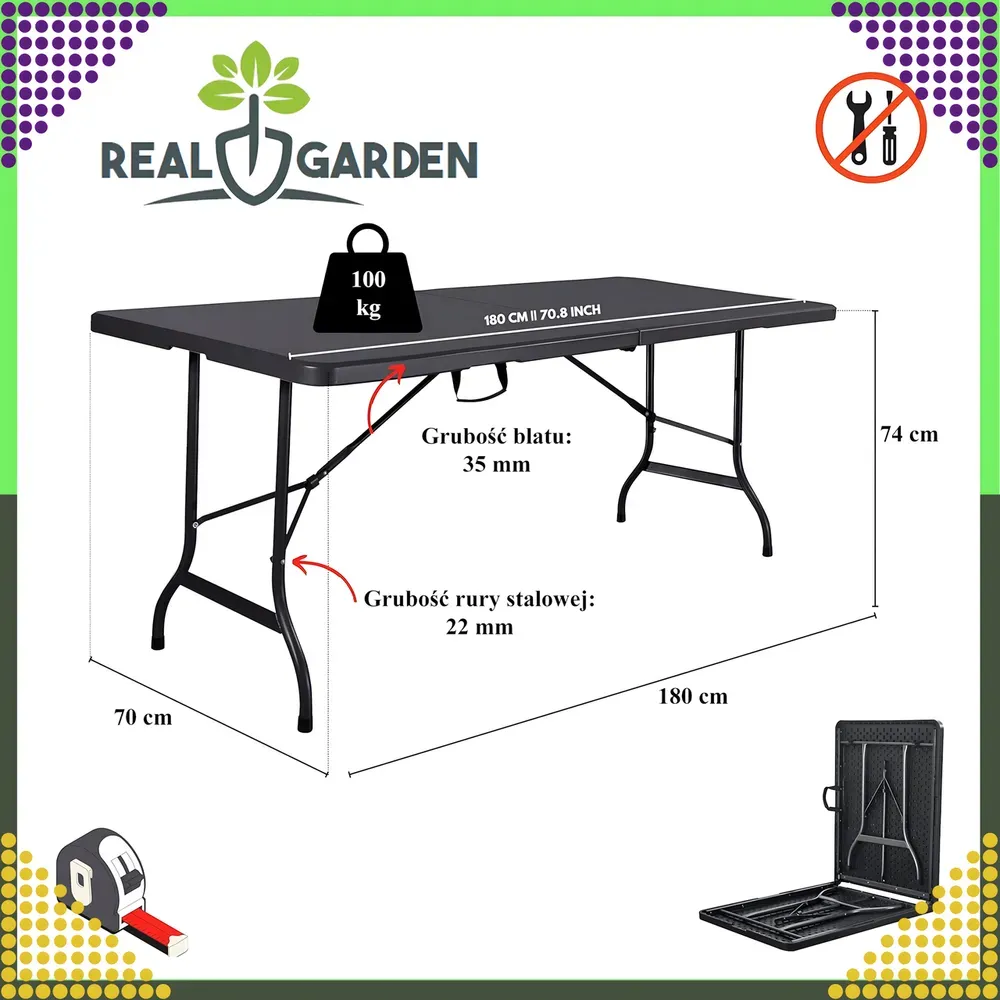 Чорний складаний стіл розміром 180 x 74 x 74 см — великий та стійкий. Його стільниця виготовлена з міцного пластику, що полегшує догляд. Складані під стільницю ніжки зроблені зі сталі та мають захист від випадкового складання під вагою їжі й напоїв. Коли стіл не використовується або його потрібно транспортувати, він легко перетворюється на стіл-валізу. У цій зручній конструкції ніжки ховаються всередину, а ручка забезпечує комфортне перенесення.