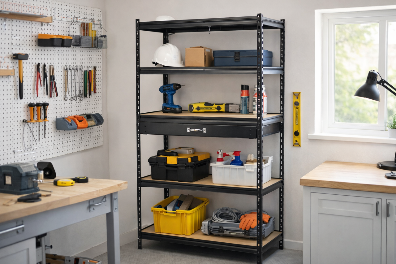 Міцна конструкція зі сталі з оцинкованим покриттям забезпечує високу стабільність і стійкість до корозії, що гарантує довгий термін служби стелажа. Регульовані полиці з МДФ дозволяють легко налаштувати висоту під різні предмети, а практична шухляда забезпечує зручне зберігання дрібних інструментів та аксесуарів.