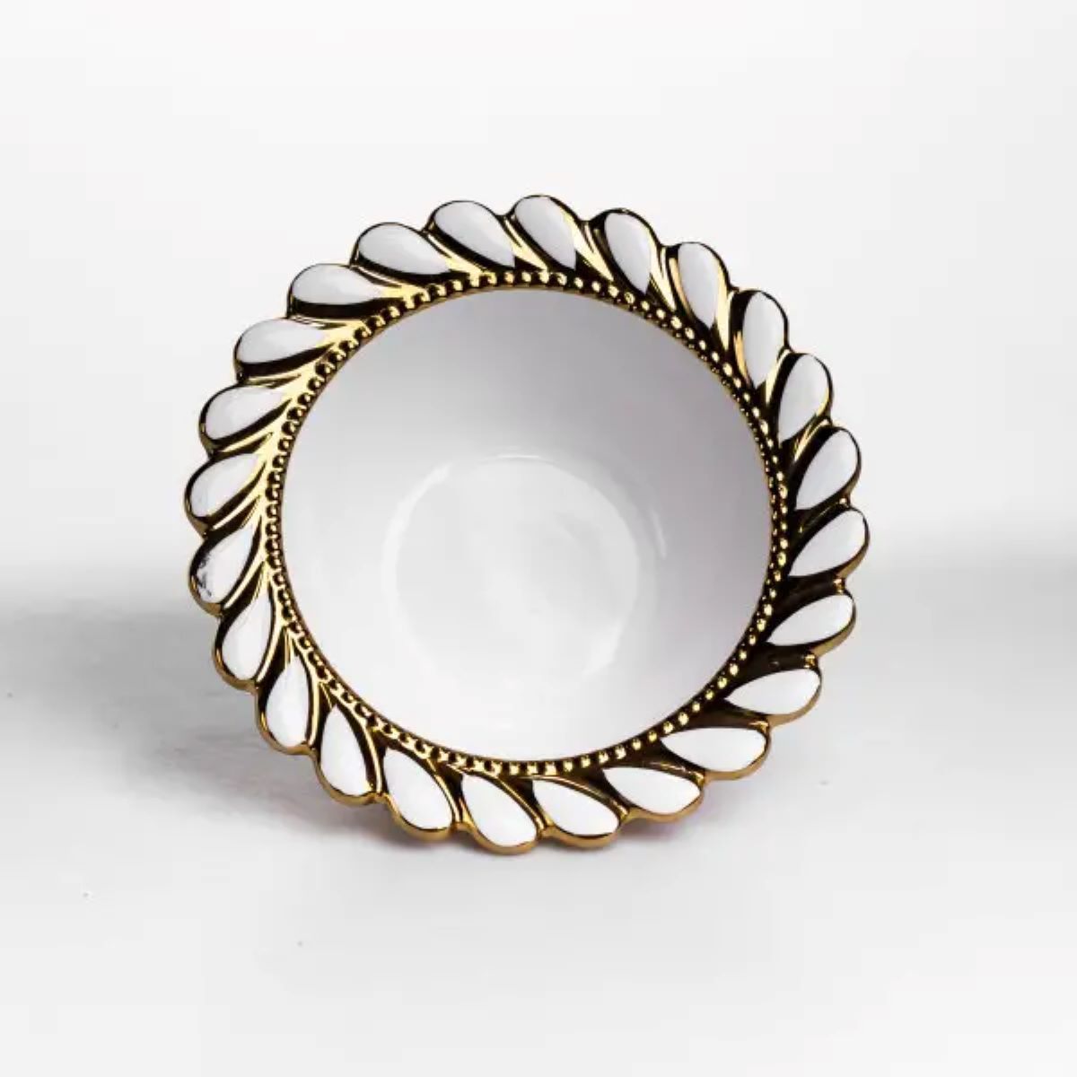 Глибока порцелянова тарілка Tiffany з діаметром 20 см підходить для подачі перших страв, салатів та гарячих страв. Висота 7 см і об’єм 600 мл забезпечують достатню місткість для порційного використання, а класична кругла форма зручна для щоденного сервірування. Тарілка практична у використанні: оптимальна вага 500 г дозволяє комфортно тримати її в руках, а глибина допомагає уникати розливання рідких страв. Порцелянова основа добре підходить для регулярного використання вдома або в закладах харчування. Край виробу оздоблений виразним ажурним візерунком із прорізними елементами по колу. Рельєфний декор поєднує хвилясті форми з акуратною золотою окантовкою, яка проходить як по зовнішньому краю, так і по внутрішньому обідку. Такий дизайн створює чіткий акцент на формі тарілки та додає їй помітності в сервіруванні без надмірної декоративності. Характеристики: Матеріал: порцеляна Форма: кругла Діаметр: 20 см Висота: 7 см Об’єм: 600 мл Вага: 500 г