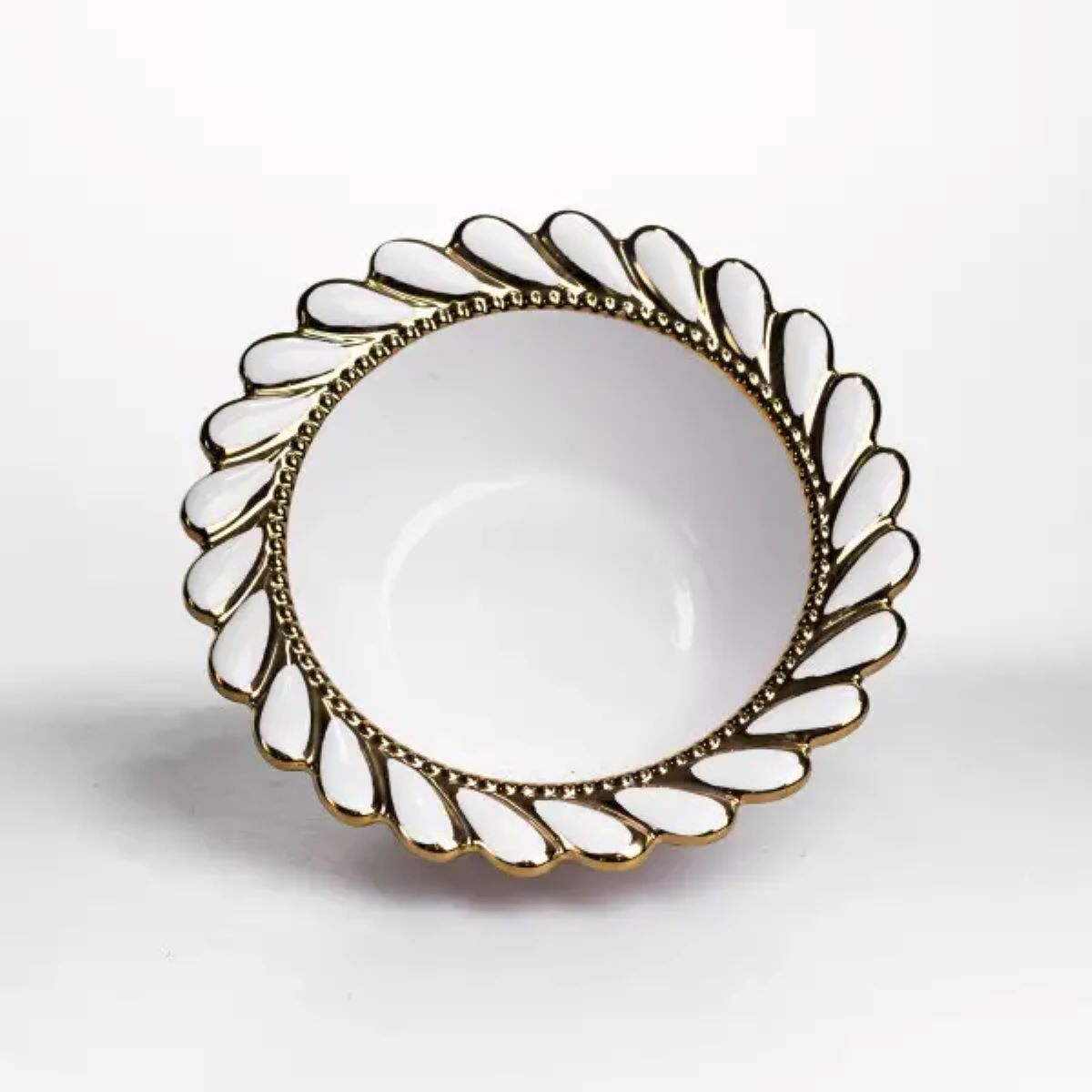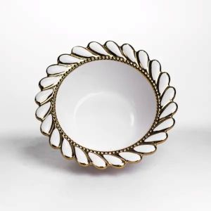 Глибока порцелянова тарілка Tiffany з діаметром 25.5 см підходить для подачі перших страв, салатів та гарячих страв. Висота 8 см і об’єм 1.4 л забезпечують достатню місткість для порційного використання, а класична кругла форма зручна для щоденного сервірування. Тарілка практична у використанні: оптимальна вага 1 кг дозволяє комфортно тримати її в руках, а глибина допомагає уникати розливання рідких страв. Порцелянова основа добре підходить для регулярного використання вдома або в закладах харчування. Край виробу оздоблений виразним ажурним візерунком із прорізними елементами по колу. Рельєфний декор поєднує хвилясті форми з акуратною золотою окантовкою, яка проходить як по зовнішньому краю, так і по внутрішньому обідку. Такий дизайн створює чіткий акцент на формі тарілки та додає їй помітності в сервіруванні без надмірної декоративності. Характеристики: Матеріал: порцеляна Форма: кругла Діаметр: 25.5 см Висота: 8 см Об’єм: 1.4 л Вага: 1 кг