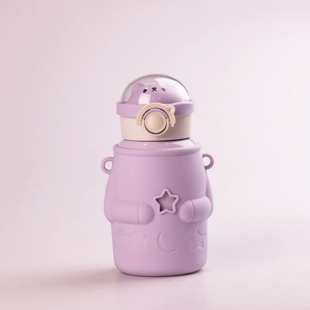 Задняя часть крышки оснащена небольшой ручкой, что обеспечивает удобный захват и управление термосом. К термосу прикреплен ремешок, который делает его легко переносимым. Этот термос не просто стильен, но невероятно удобен в использовании. Он точно придется по вкусу вашему ребенку.