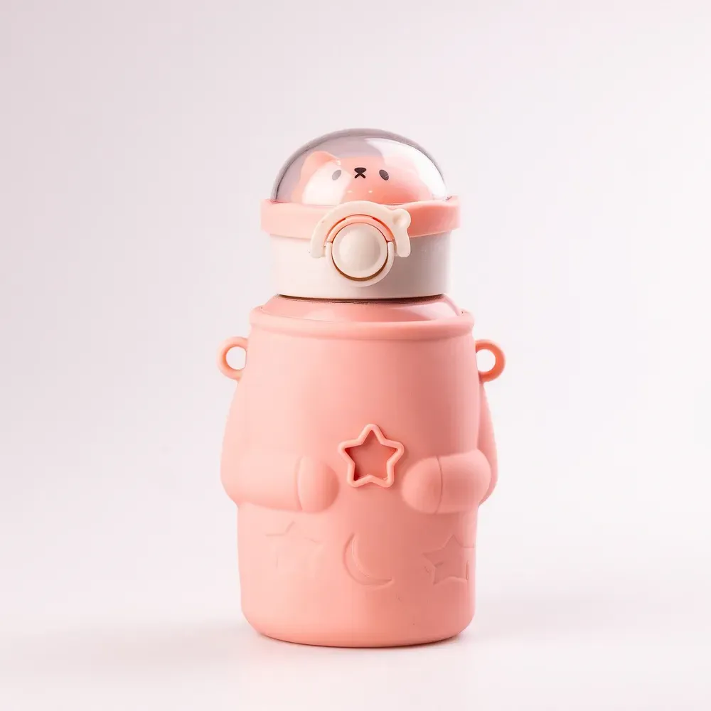 Задняя часть крышки оснащена небольшой ручкой, что обеспечивает удобный захват и управление термосом. К термосу прикреплен ремешок, который делает его легко переносимым. Этот термос не просто стильен, но невероятно удобен в использовании. Он точно придется по вкусу вашему ребенку.