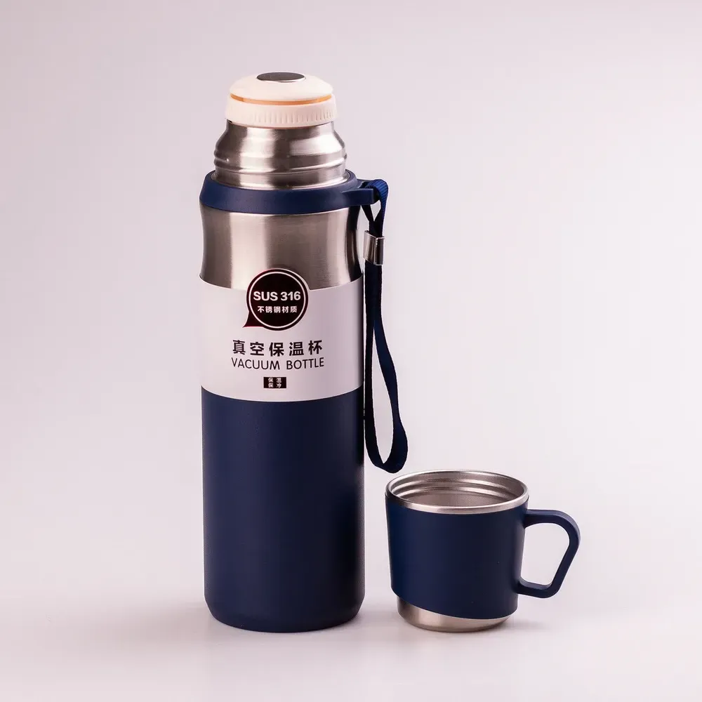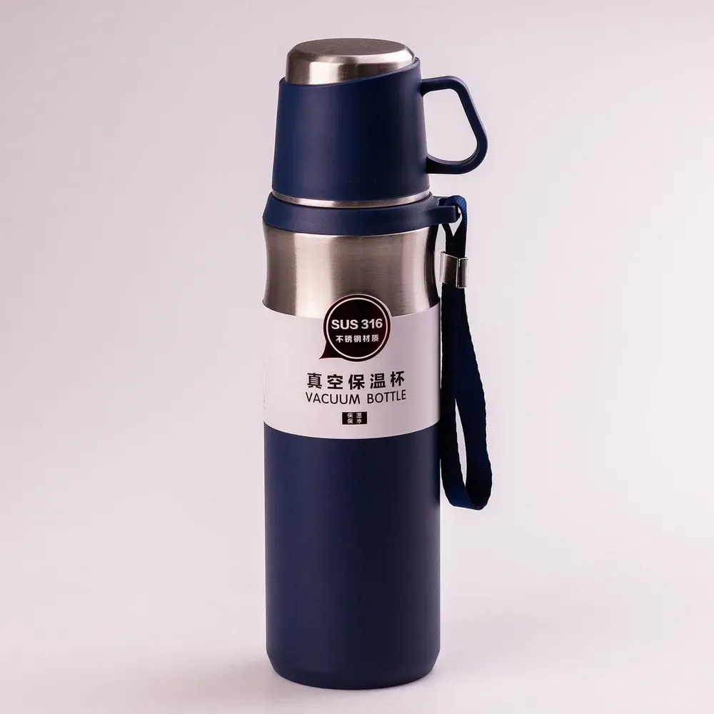 Термос с чашкой и ремешком 600мл из нержавеющей стали тепло до 12 часов (HPGM80155BL)