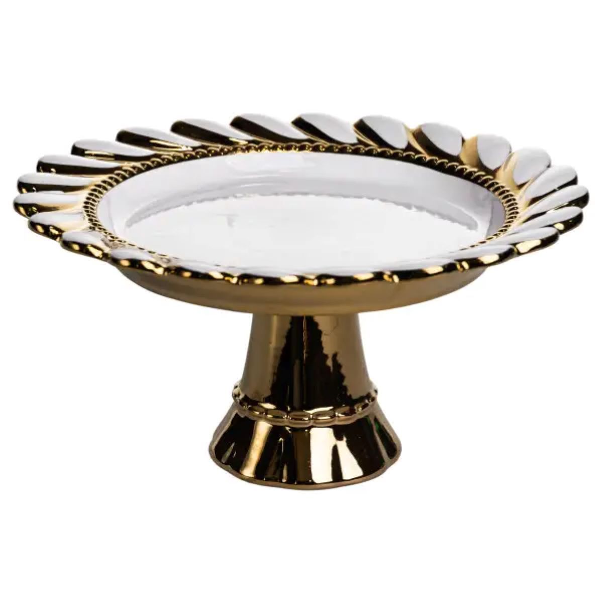 Порцелянова тортівниця на ніжці поєднує класичну елегантність із функціональністю. Білий порцеляновий корпус забезпечує чистоту й легкість візуального сприйняття, а декоративний обідок із золотим оздобленням підкреслює форму та додає чіткості лініям. Візерунок на обідку складається з дрібних рельєфних елементів, що нагадують намистини або листочки, створюючи витончений акцент без надмірної помпезності. Ніжка тортівниці масивна, золотого кольору, з плавними лініями, що розширюються донизу. Вона забезпечує стійкість виробу та надійну опору для страв різної ваги. Така конструкція робить тортівницю практичною для щоденного використання, а одночасно додає столу елегантності під час сервірування десертів або святкових страв. Поєднання білої порцелянової основи та золотих акцентів робить тортівницю декоративним елементом у будь-якому інтер’єрі. Орнамент із дрібних рельєфних деталей створює стильну композицію, яка виглядає органічно та підкреслює увагу до деталей у сервіруванні, не перевантажуючи загальний дизайн. Характеристики: Матеріал: порцеляна Декор: рельєфний обідок із дрібними елементами, золота окантовка Форма: кругла, на ніжці