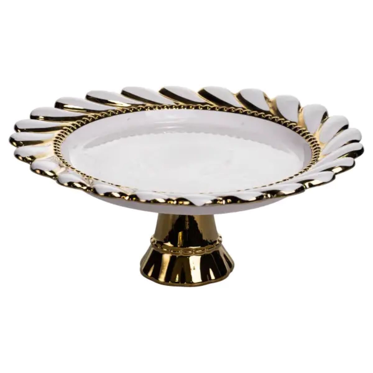 Порцелянова тортівниця на ніжці поєднує класичну елегантність із функціональністю. Білий порцеляновий корпус забезпечує чистоту й легкість візуального сприйняття, а декоративний обідок із золотим оздобленням підкреслює форму та додає чіткості лініям. Візерунок на обідку складається з дрібних рельєфних елементів, що нагадують намистини або листочки, створюючи витончений акцент без надмірної помпезності. Ніжка тортівниці масивна, золотого кольору, з плавними лініями, що розширюються донизу. Вона забезпечує стійкість виробу та надійну опору для страв різної ваги. Така конструкція робить тортівницю практичною для щоденного використання, а одночасно додає столу елегантності під час сервірування десертів або святкових страв. Поєднання білої порцелянової основи та золотих акцентів робить тортівницю декоративним елементом у будь-якому інтер’єрі. Орнамент із дрібних рельєфних деталей створює стильну композицію, яка виглядає органічно та підкреслює увагу до деталей у сервіруванні, не перевантажуючи загальний дизайн. Характеристики: Матеріал: порцеляна Декор: рельєфний обідок із дрібними елементами, золота окантовка Форма: кругла, на ніжці